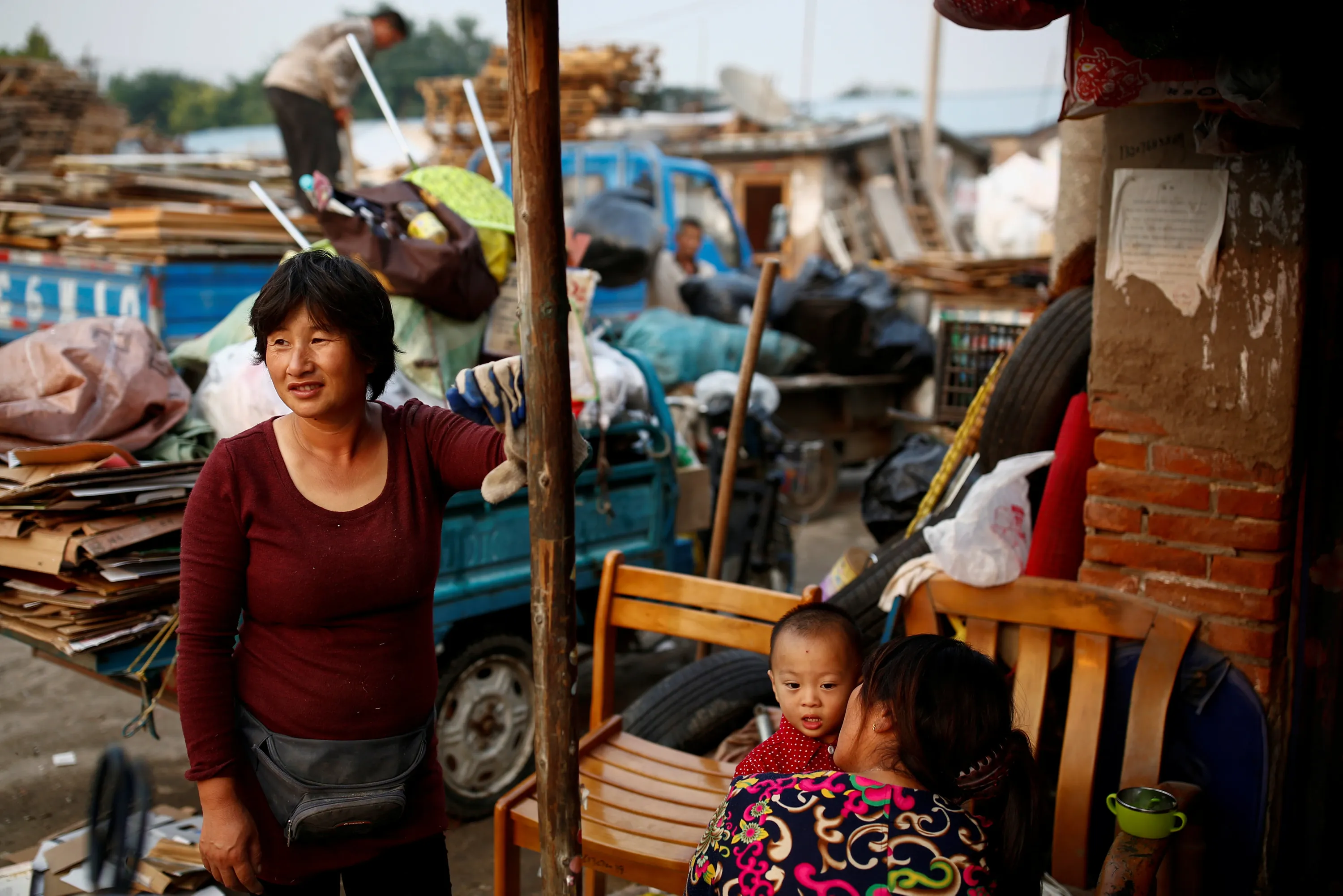 Huan (R) and her son Peijun sit outside their hut as they talk with a neighbour at a recycling yard at the edge of Beijing, China, September 21, 2016. (Photo by Thomas Peter/Reuters)