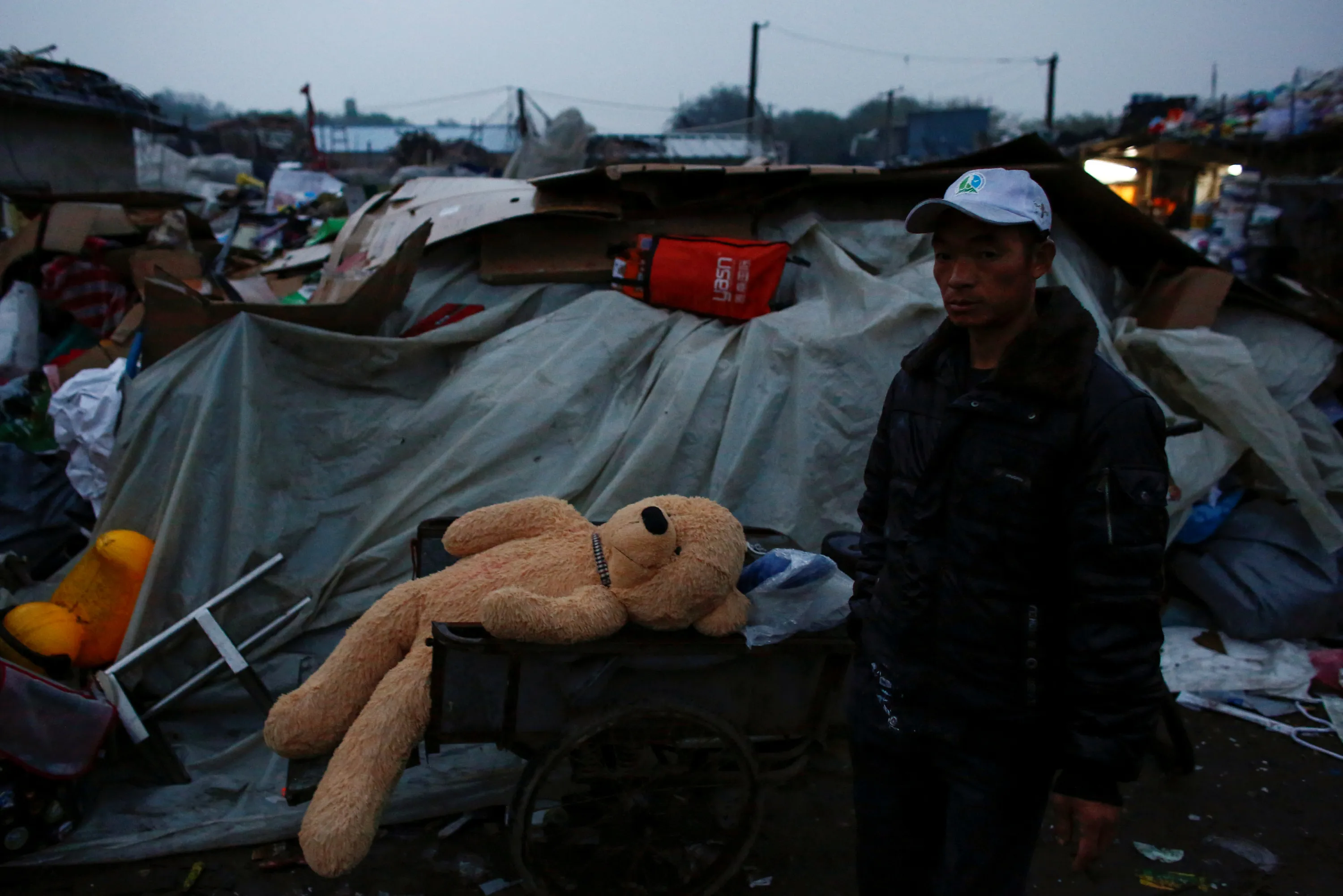 A man walks past a discarded teddybear soft toy at a recycling yard at the edge of Beijing, China, October 20, 2016. (Photo by Thomas Peter/Reuters)