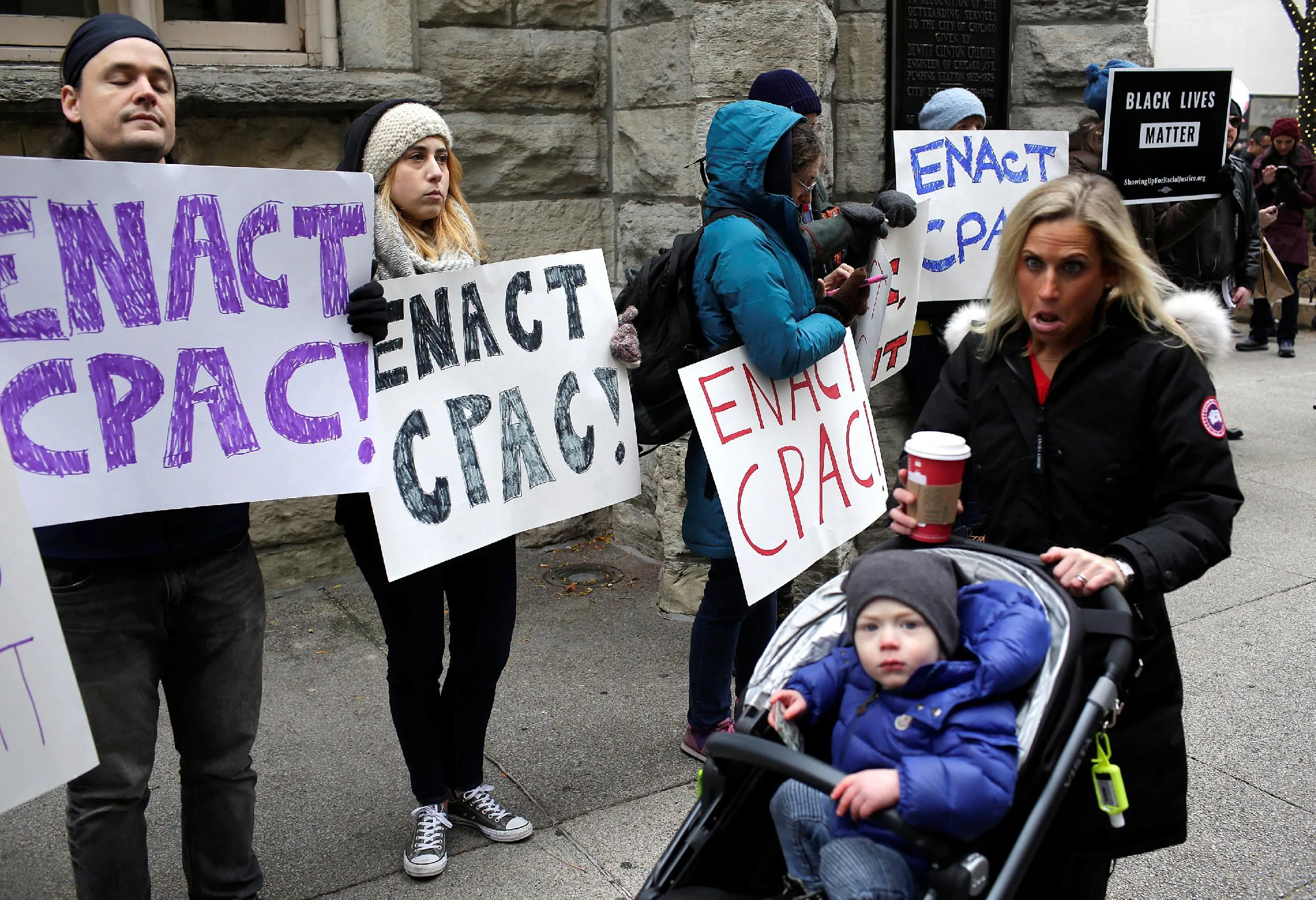 A woman pushing a child in a stroller reacts as she walks past demonstrators holding signs as protesters try to disrupt Black Friday shopping in Chicago, Illinois, November 25, 2016. The protests are in reaction to the recent fatal police shootings of Joshua Beal and Kajuan Raye, who were recently killed by Chicago police officers in separate incidents in November. (Photo by Joshua Lott/Reuters)