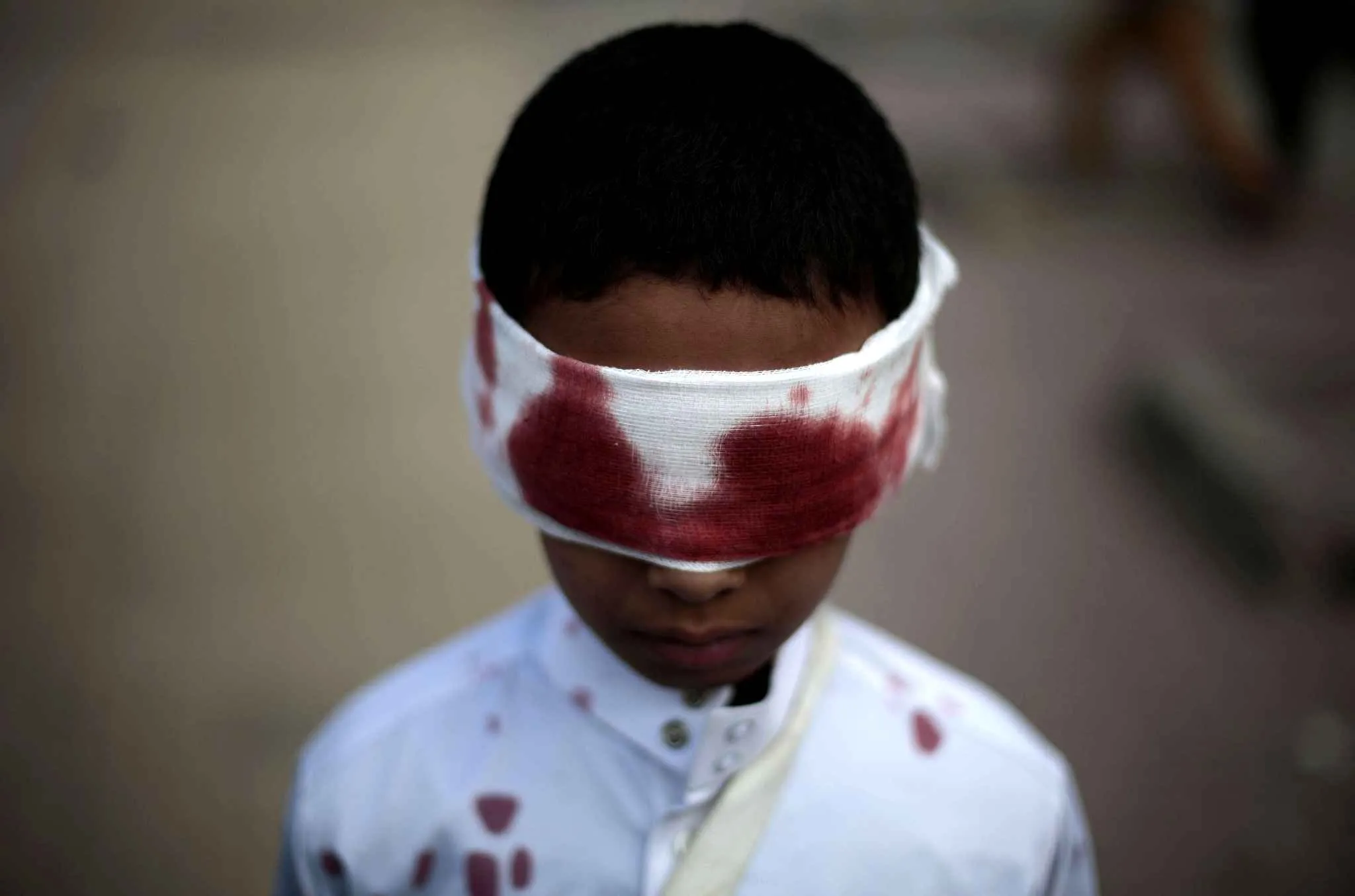 A boy with fake blood on his face and clothes to represent a victim participates in a protest against Saudi-led airstrikes in Sanaa, Yemen, Sunday, November 27, 2016. (Photo by Hani Mohammed/AP Photo)