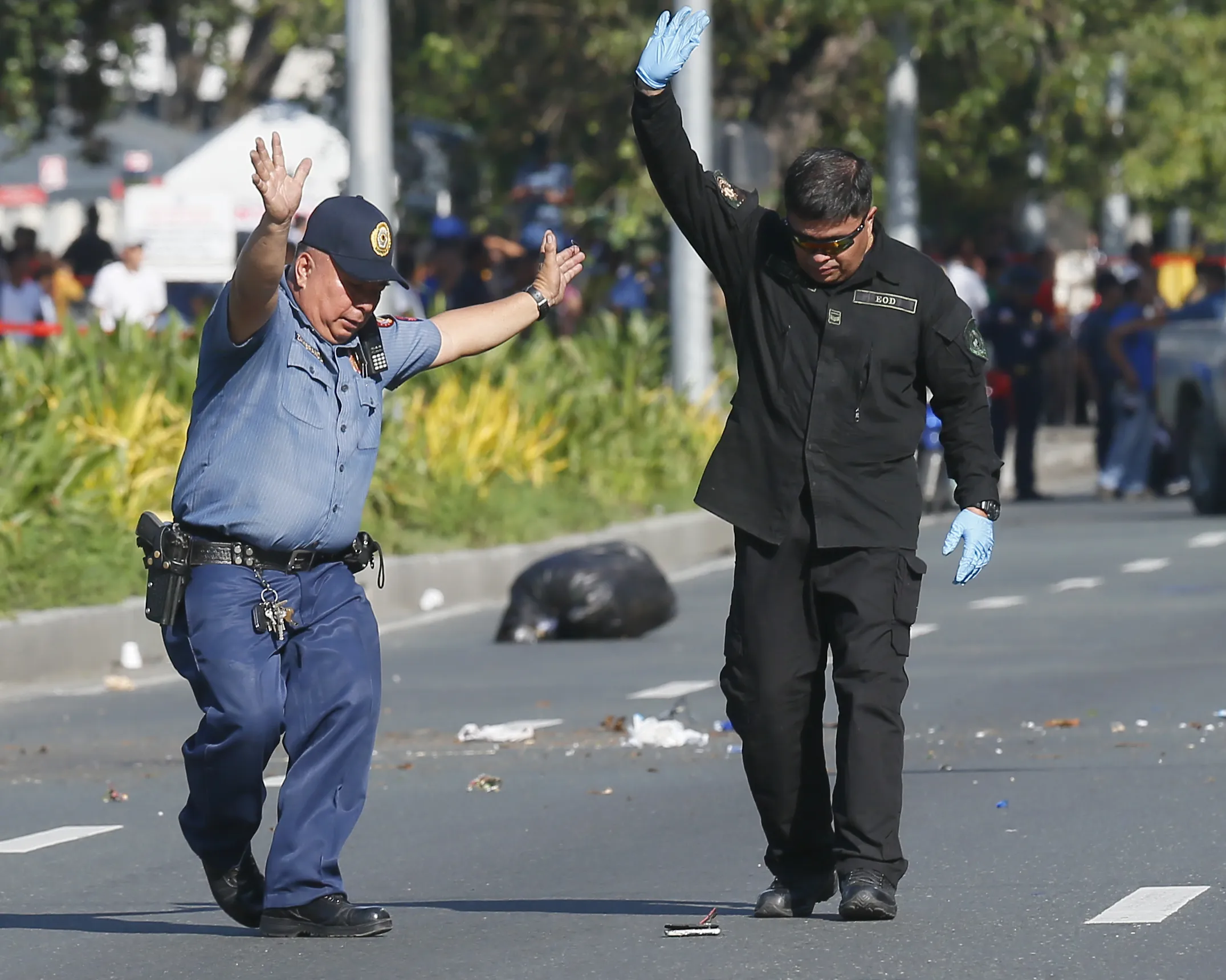 Philippine National Police bomb disposal squad members pause to retrieve a cellphone as they comb the scene after detonating a package believed to be suspected IED or Improvised Explosive Device that was found in the trash bin near the U.S. Embassy in Manila, Philippines Monday, November 28, 2016. Police said they are still investigating in that pieces of evidence will be subjected to forensics examination. (Photo by Bullit Marquez/AP Photo)