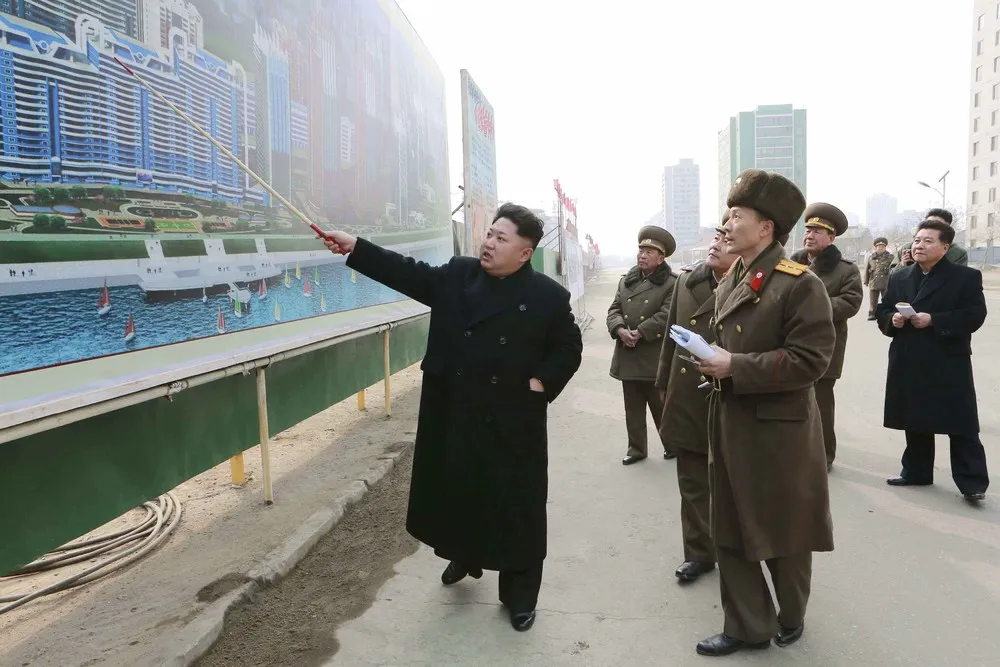 North Korean leader Kim Jong Un (L) issues instructions while visiting the construction site of the Mirae Scientists Street in Pyongyang in this undated photo released by North Korea's Korean Central News Agency (KCNA) in Pyongyang February 15, 2015. REUTERS/KCNA (NORTH KOREA - Tags: POLITICS) ATTENTION EDITORS - THIS PICTURE WAS PROVIDED BY A THIRD PARTY. REUTERS IS UNABLE TO INDEPENDENTLY VERIFY THE AUTHENTICITY, CONTENT, LOCATION OR DATE OF THIS IMAGE. FOR EDITORIAL USE ONLY. NOT FOR SALE FOR MARKETING OR ADVERTISING CAMPAIGNS. THIS PICTURE IS DISTRIBUTED EXACTLY AS RECEIVED BY REUTERS, AS A SERVICE TO CLIENTS. NO THIRD PARTY SALES. NOT FOR USE BY REUTERS THIRD PARTY DISTRIBUTORS. SOUTH KOREA OUT. NO COMMERCIAL OR EDITORIAL SALES IN SOUTH KOREA