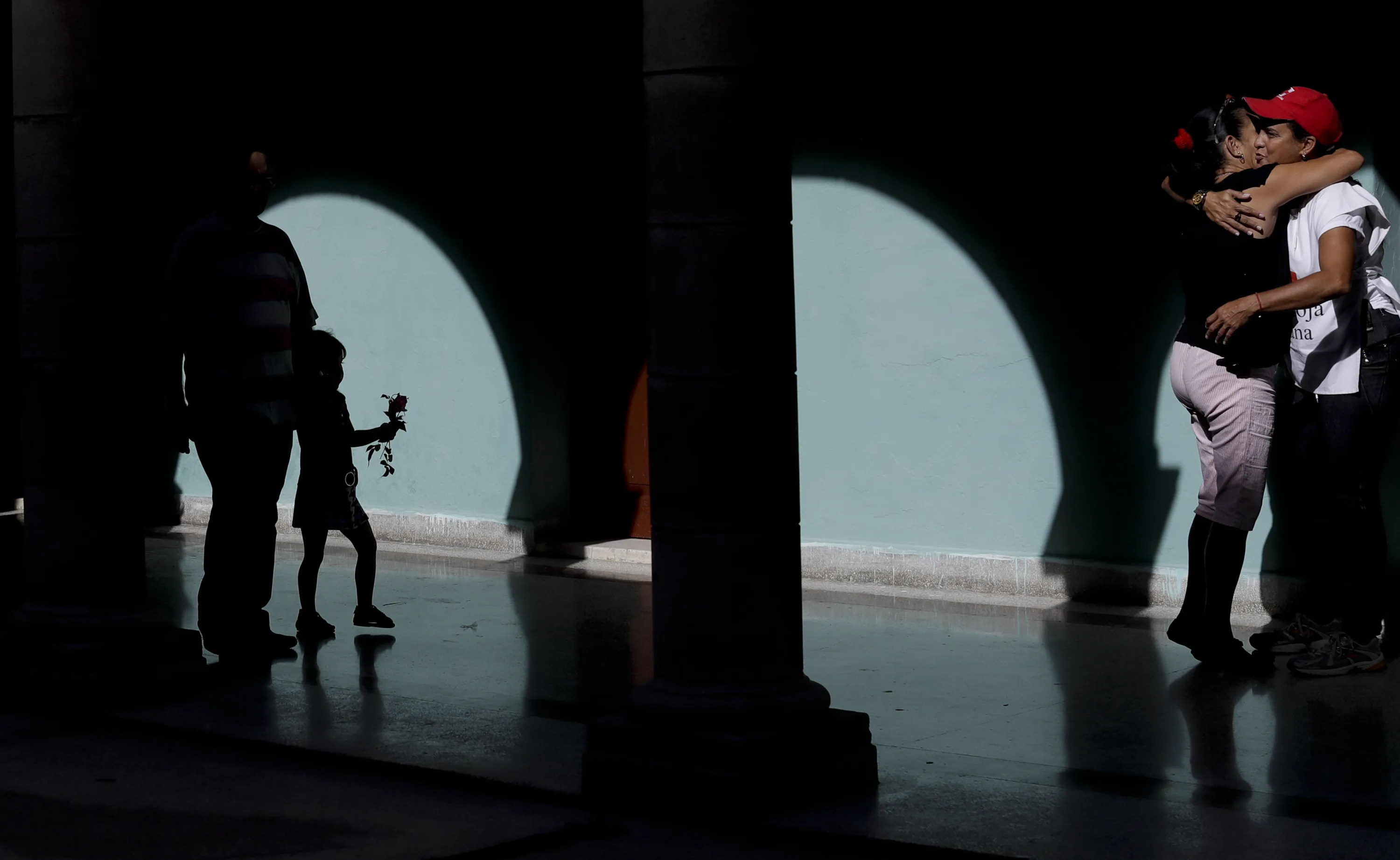 A girl holding a rose enters at a memorial in honor of late Fidel Castro as two women hug each other in Guanabacoa on the outskirts in Havana, Cuba, Tuesday, November 29, 2016. (Photo by Natacha Pisarenko/AP Photo)