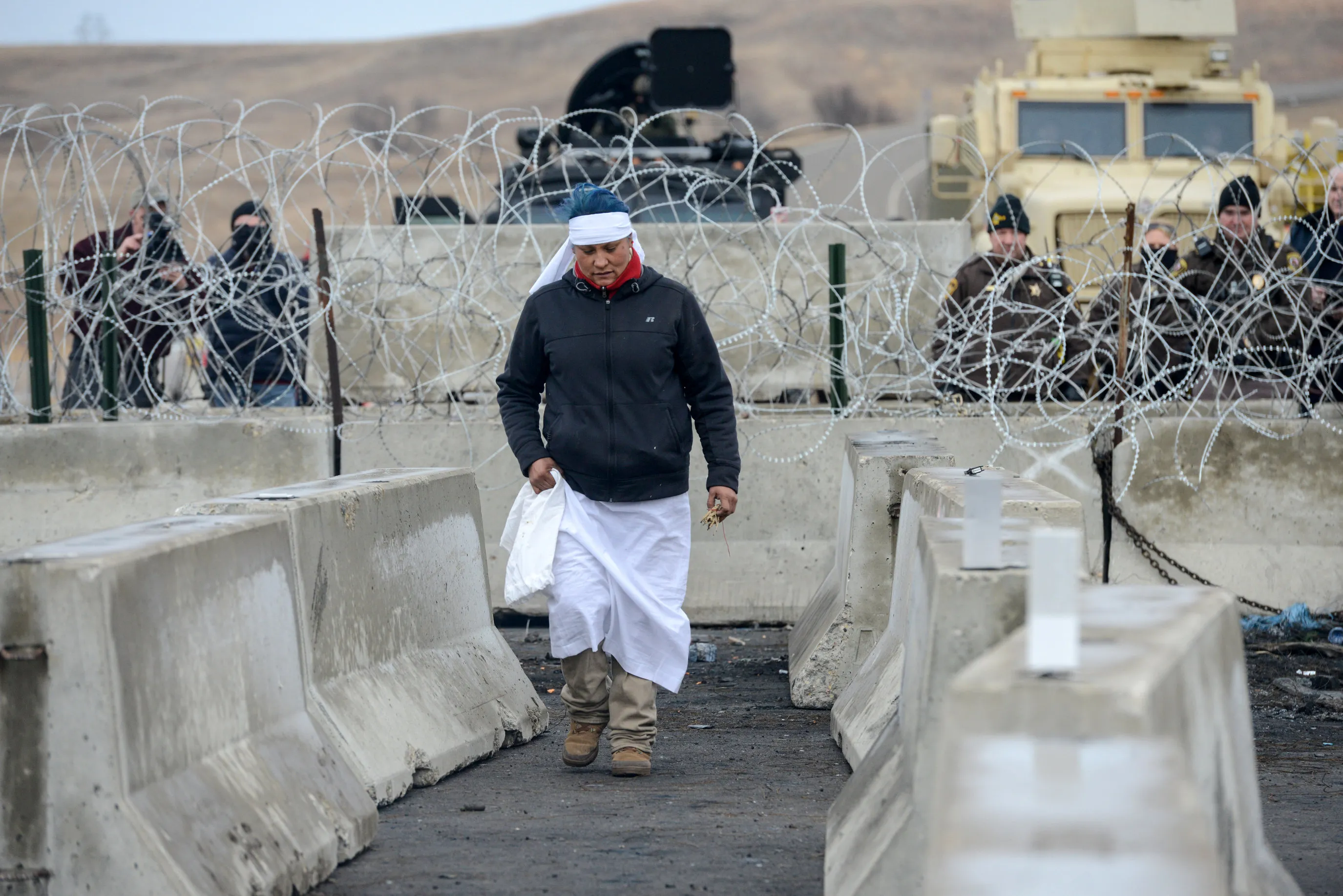 A woman returns from the barricade after speaking with police on Backwater Bridge during a protest against plans to pass the Dakota Access pipeline near the Standing Rock Indian Reservation, near Cannon Ball, North Dakota, U.S. November 27, 2016. (Photo by Stephanie Keith/Reuters)