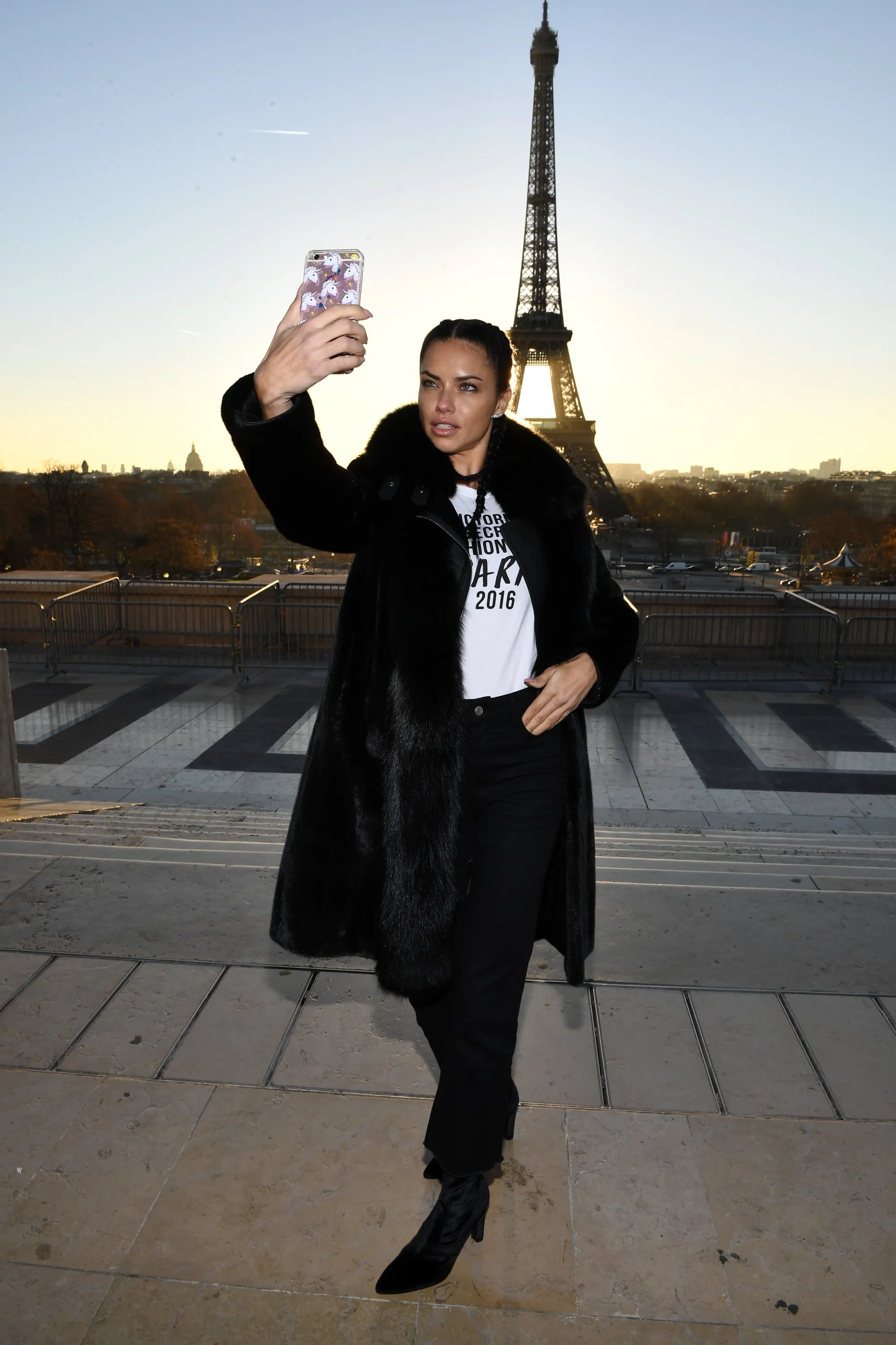 Adriana Lima takes a selfie in front of the Eiffel Tower prior the 2016 Victoria's Secret Fashion Show on November 29, 2016 in Paris, France. (Photo by Dimitrios Kambouris/Getty Images for Victoria's Secret)