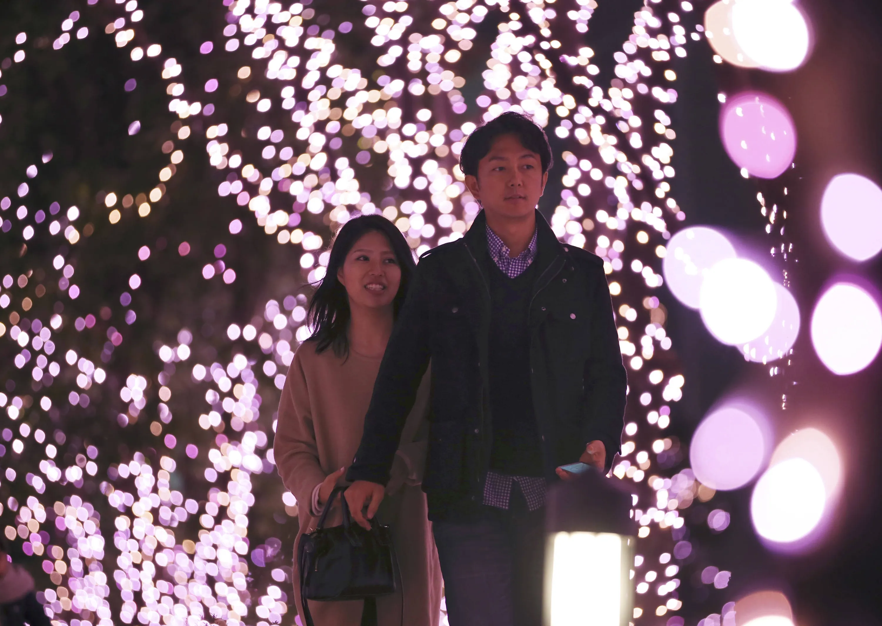 A couple walks through Christmas illuminations at a shopping area near Shinjuku Station in Tokyo, Saturday, November 19, 2016. (Photo by Koji Sasahara/AP Photo)