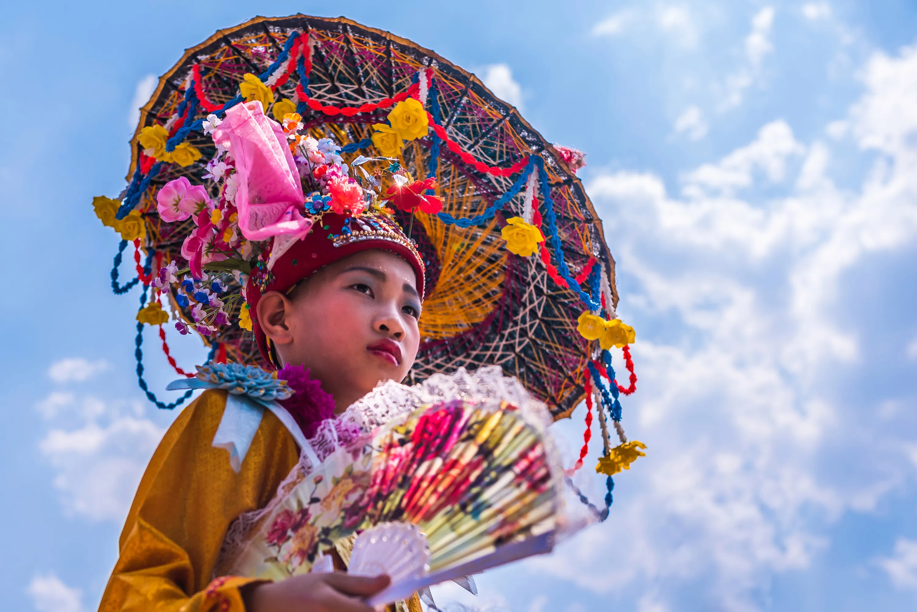 The young initiates also wear full face make up and guides accompany them with umbrellas to protect them from the sun's heat in Mae Hong Son, Thailand, April 2016. (Photo by Claudio Sieber/Barcroft Images)