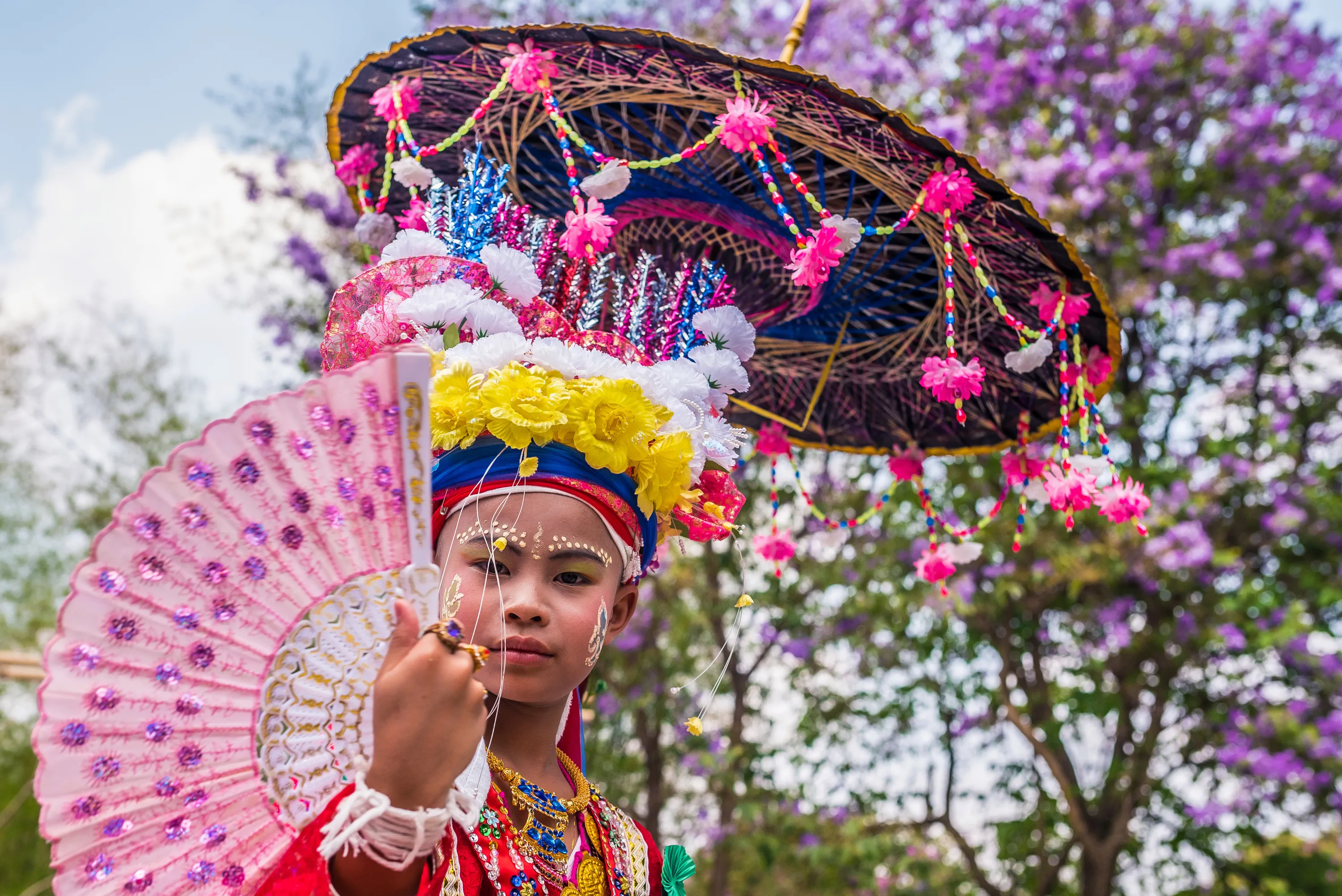 An initiate sprays out his fan as he enjoys the view from atop his father's shoulders during the ceremony in Mae Hong Son, Thailand, April 2016. (Photo by Claudio Sieber/Barcroft Images)