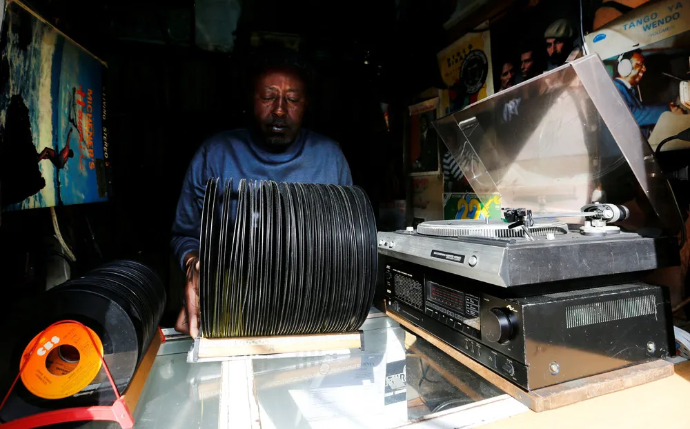 Vendor James Rugami removes vinyl records from the rays of the sun in his twin stalls that specialize in selling second-hand vinyl records and restoration of vintage players at the Kenyatta Market in Nairobi, Kenya November 24, 2016. (Photo by Thomas Mukoya/Reuters)