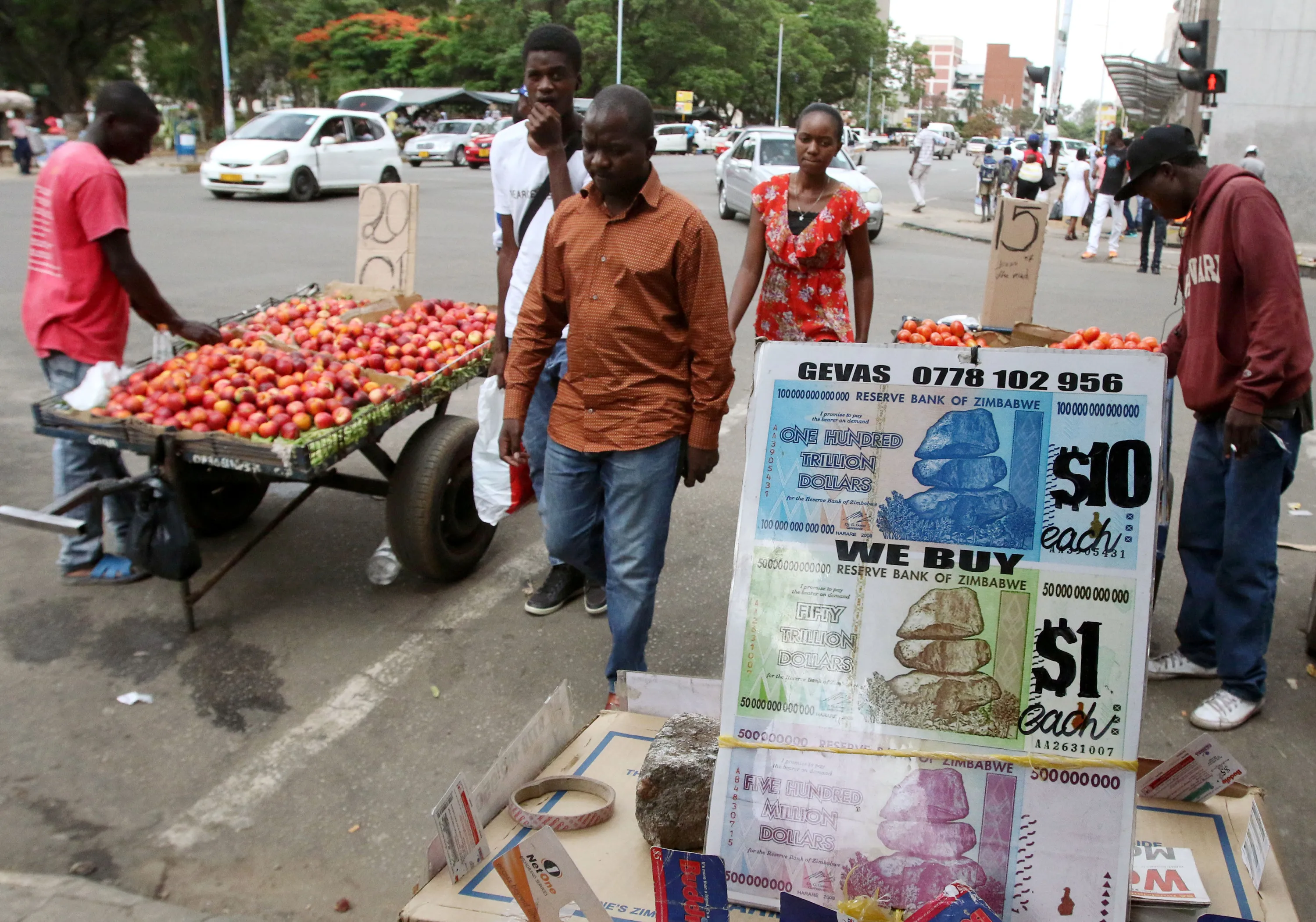 Locals walk past old currency notes on display along a street in the capital Harare, Zimbabwe, November 18, 2016. (Photo by Philimon Bulawayo/Reuters)
