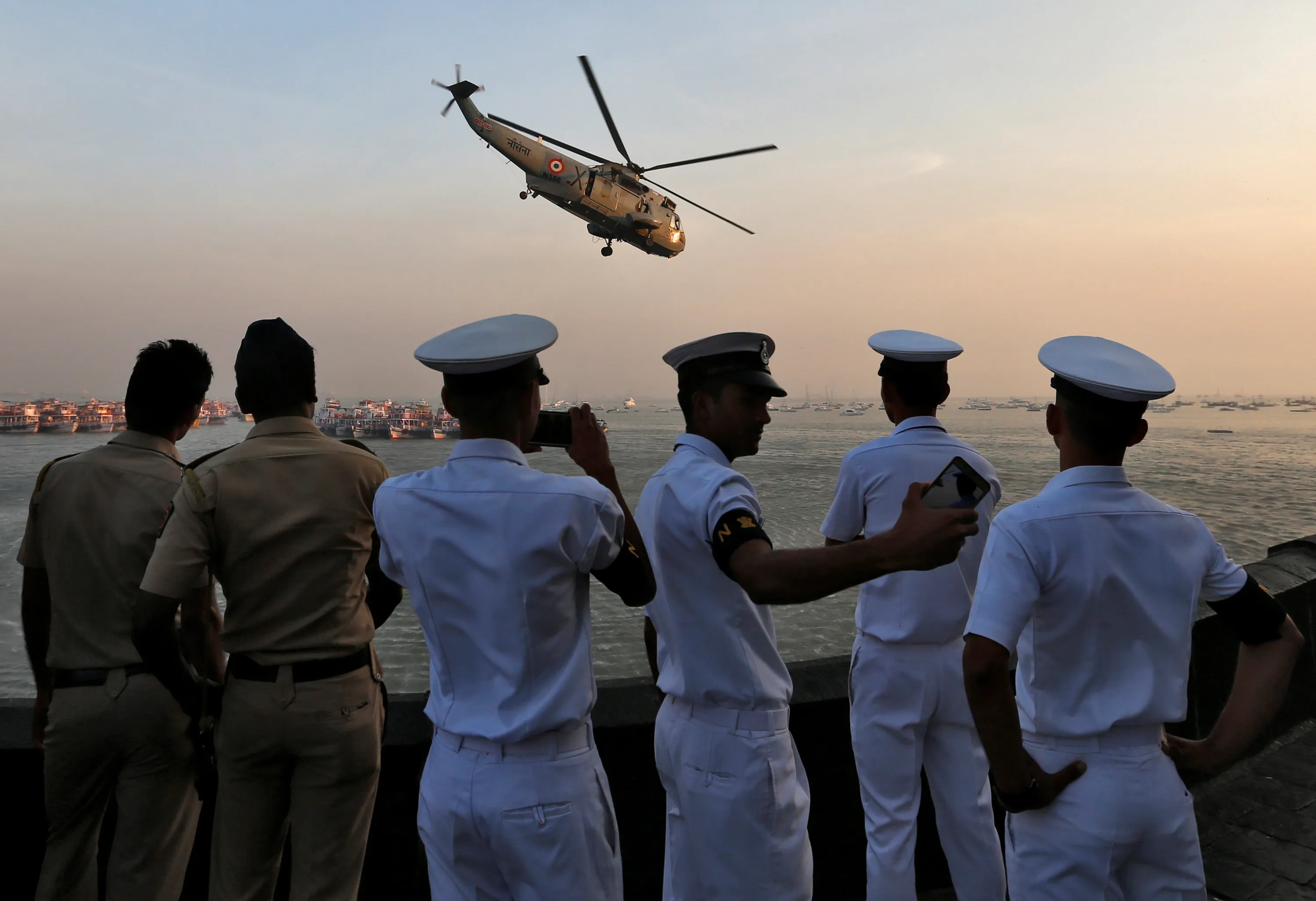 Indian Navy soldiers and policemen watch the rehearsal ahead of Navy Day celebrations in Mumbai, India, December 1, 2016. (Photo by Danish Siddiqui/Reuters)