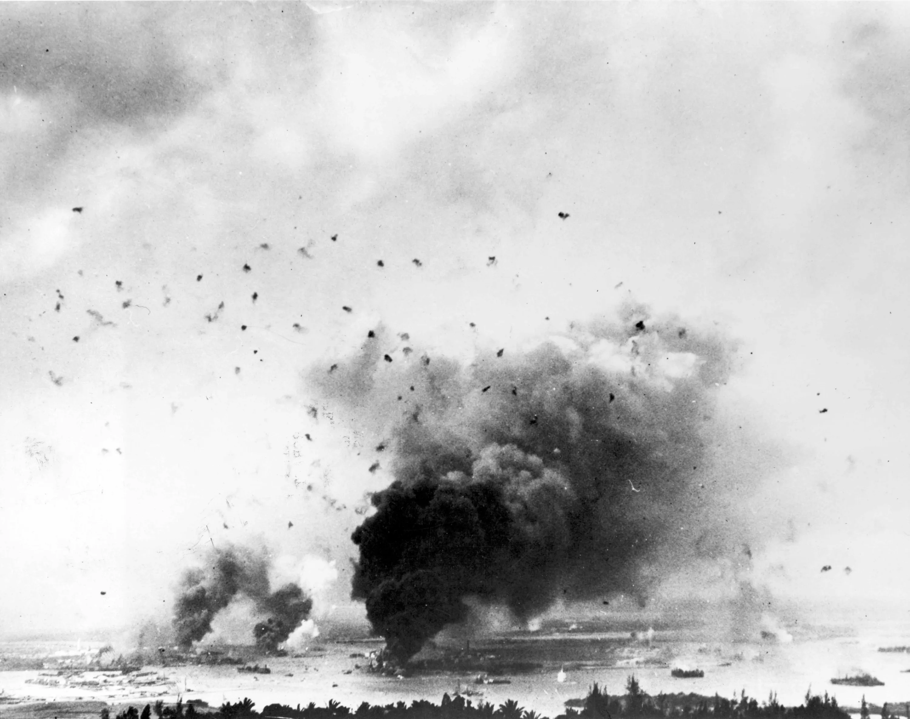 Flak bursts of anti-aircraft shells pepper the skyline above rising smoke from the battleship USS Arizona during the Japanese raid on Pearl Harbor, Hawaii, U.S. December 7, 1941. (Photo by Reuters/U.S. Navy/National Archives)