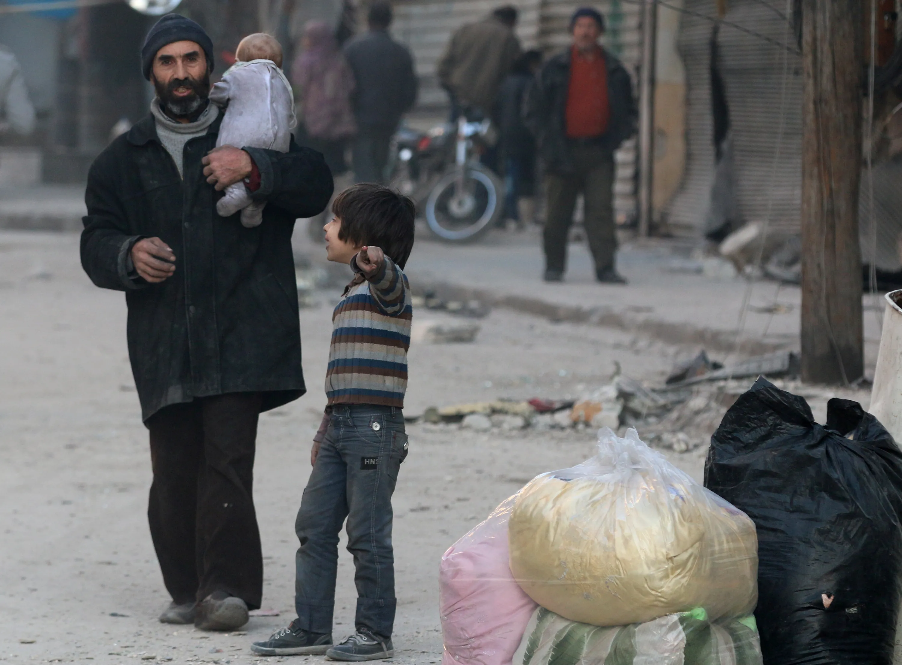 A boy gestures as he chats with his father in the rebel-held besieged al-Shaar neighborhood of Aleppo, Syria November 23, 2016. (Photo by Abdalrhman Ismail/Reuters)