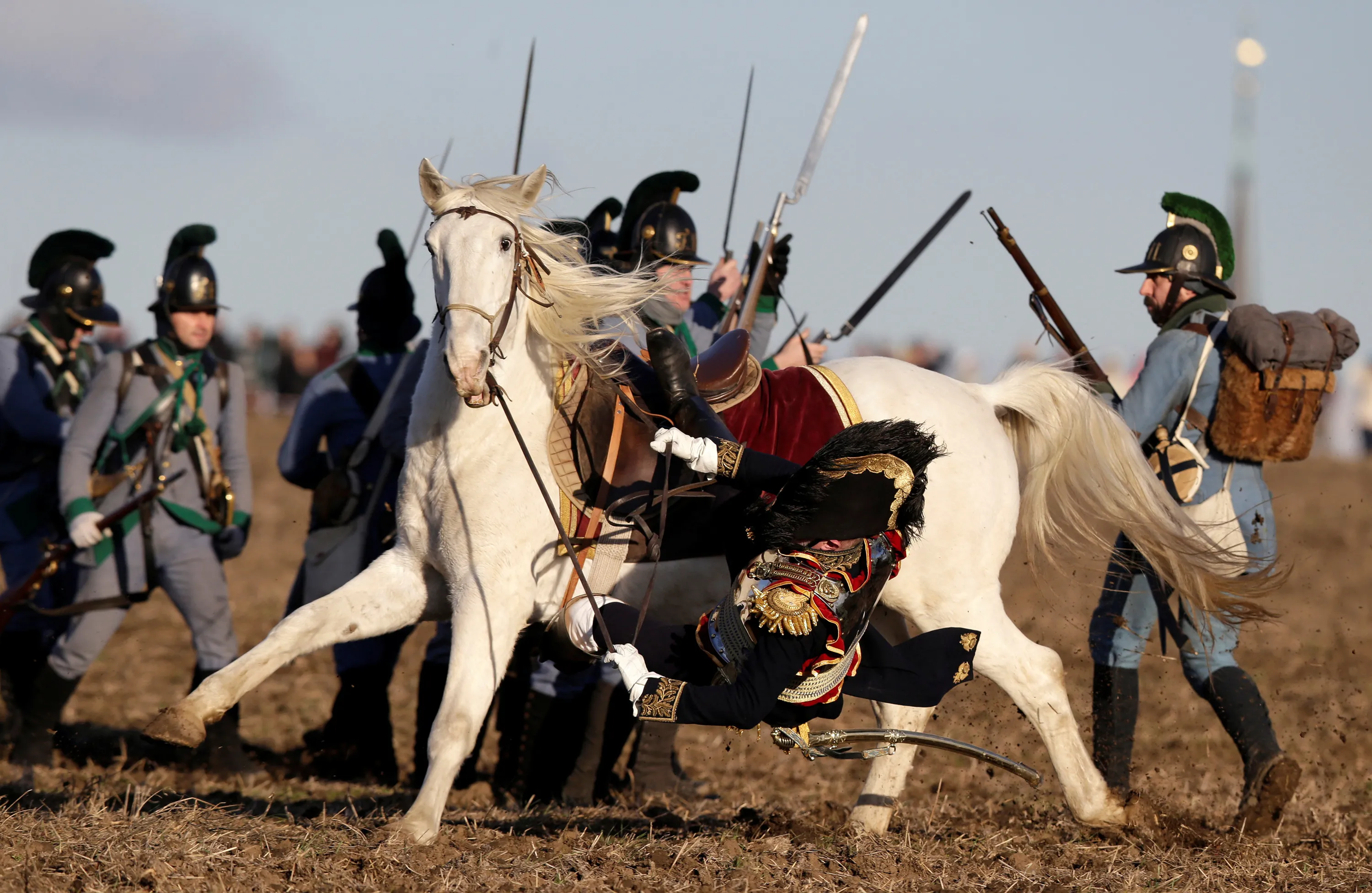 A history enthusiast, dressed as a soldier, falls from his horse during the re-enactment of Napoleon's famous battle of Austerlitz near the southern Moravian town of Slavkov u Brna, Czech Republic December 3, 2016. (Photo by David W. Cerny/Reuters)