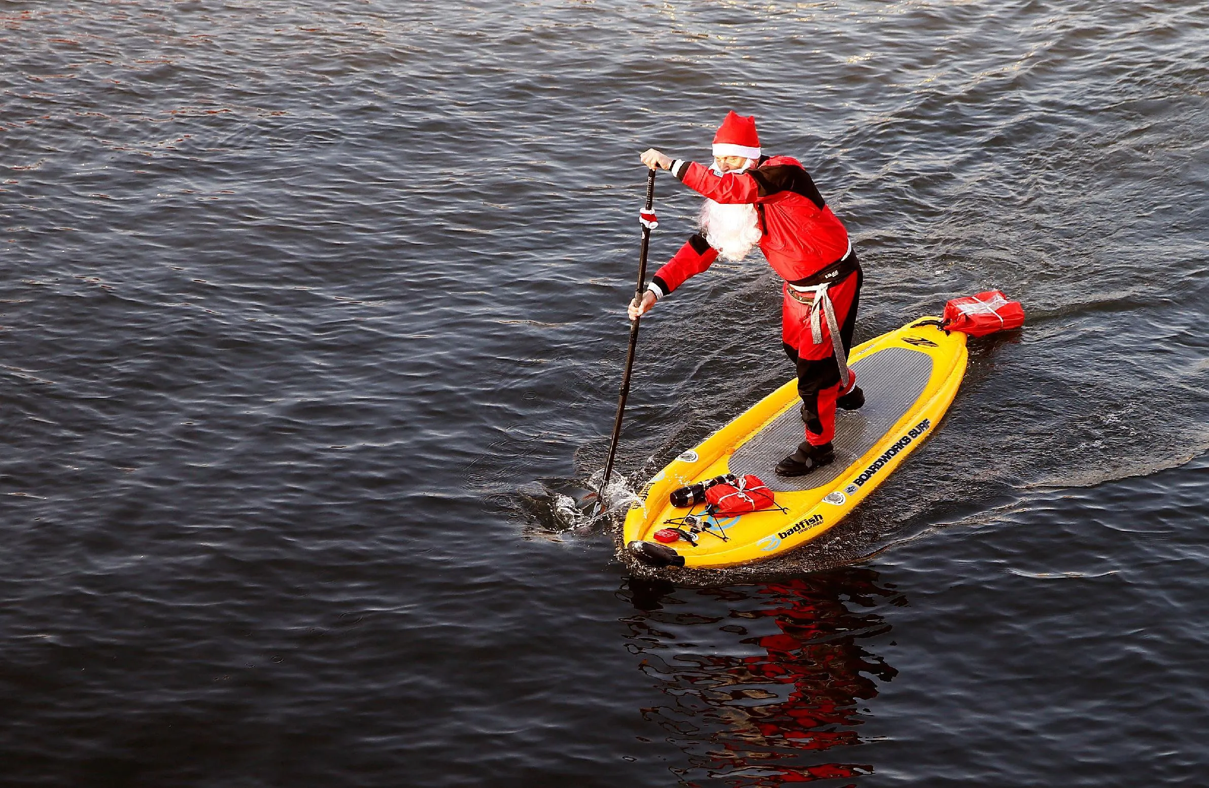 A man dressed as a Santa Claus (Samichlaus) crosses the Limmat river on his stand-up paddle in Zurich, Switzerland December 4, 2016. (Photo by Arnd Wiegmann/Reuters)