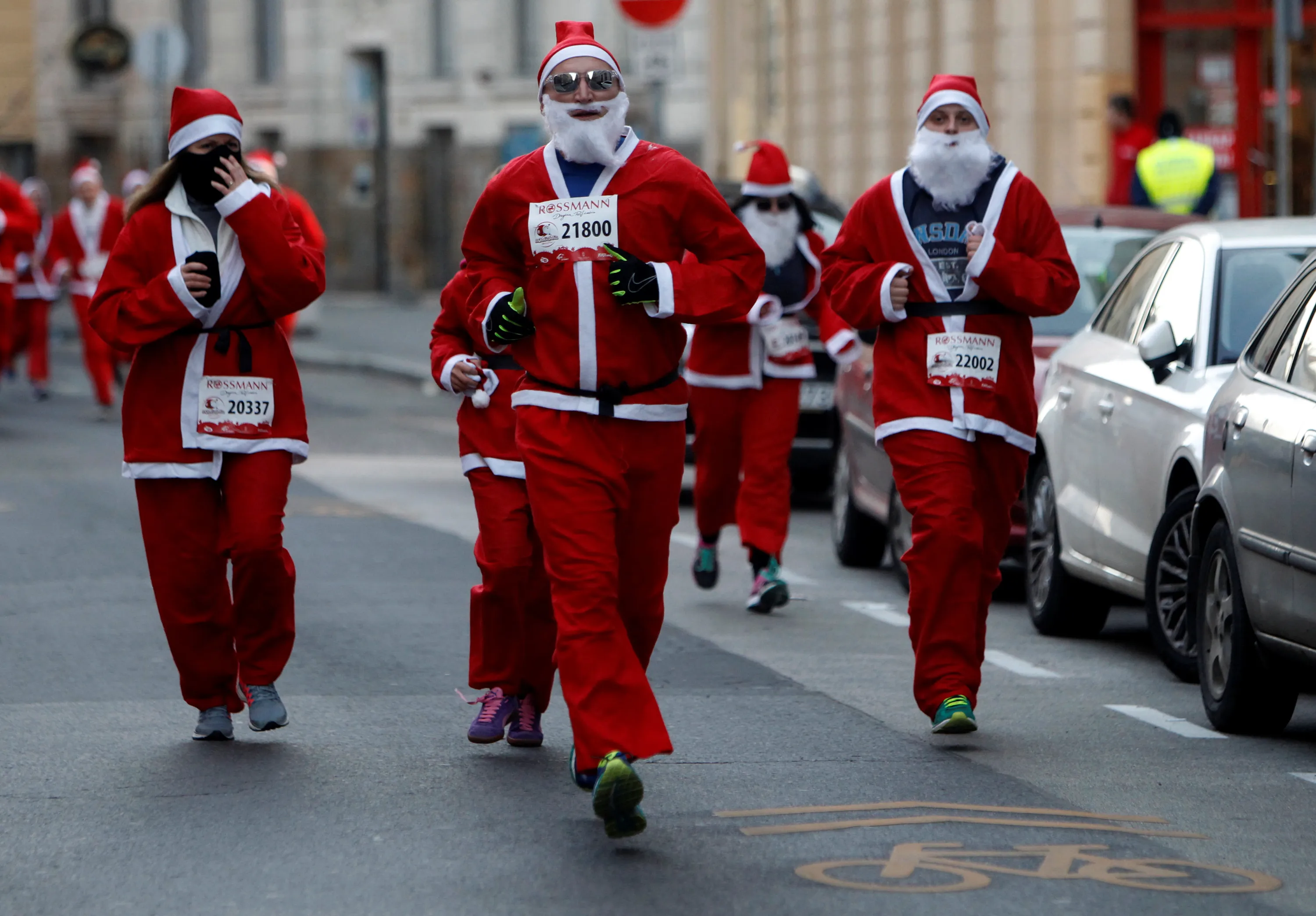 Runners dressed in Santa Claus costumes take part in the Santa Claus Run in Budapest, Hungary, December 4, 2016. (Photo by Bernadett Szabo/Reuters)