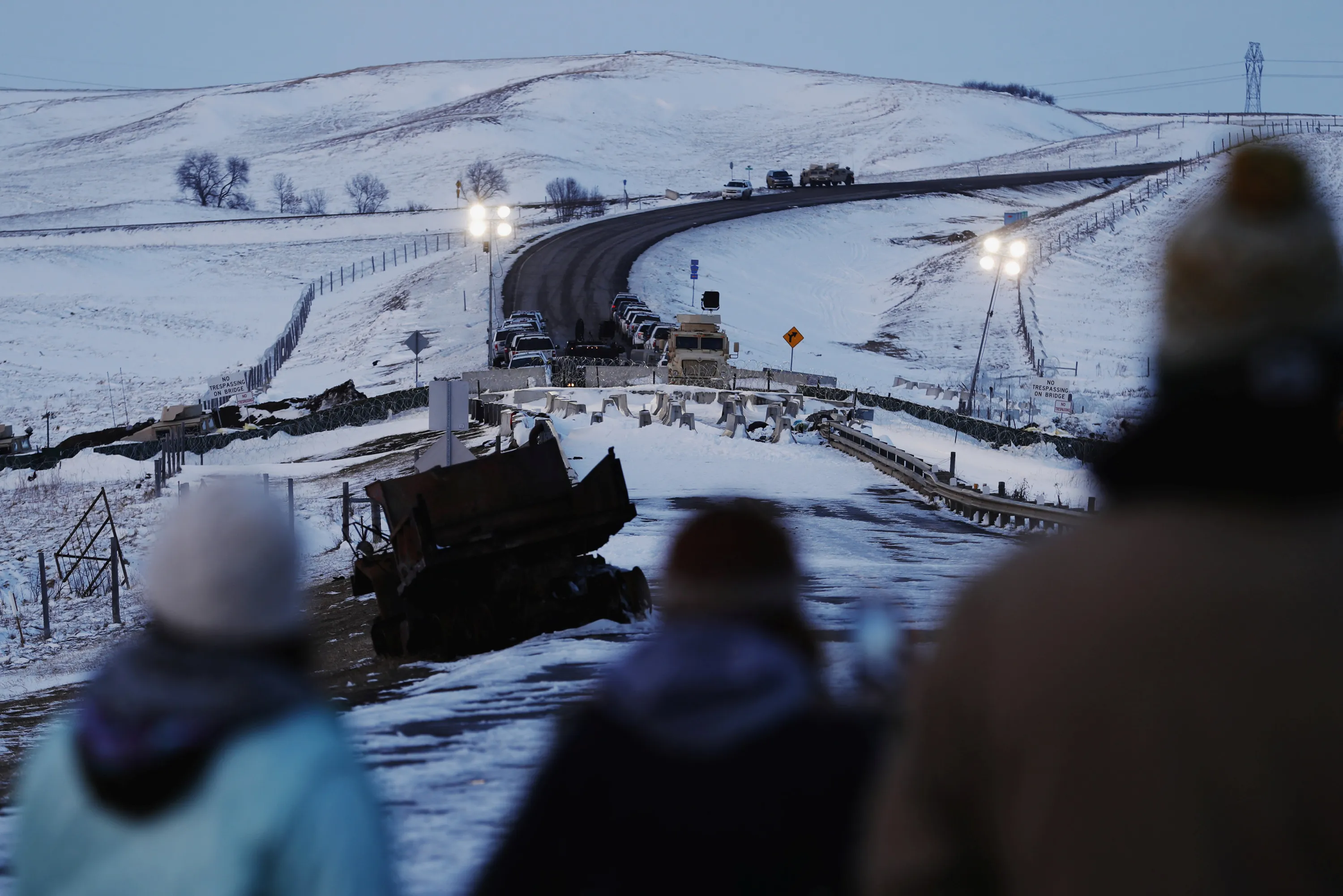 Campers stand and watch as members of the National Guard and police departments guard the Backwater Bridge near the Oceti Sakowin camp as “water protectors” continue to demonstrate against plans to pass the Dakota Access pipeline near the Standing Rock Indian Reservation, near Cannon Ball, North Dakota, U.S., December 3, 2016. (Photo by Lucas Jackson/Reuters)