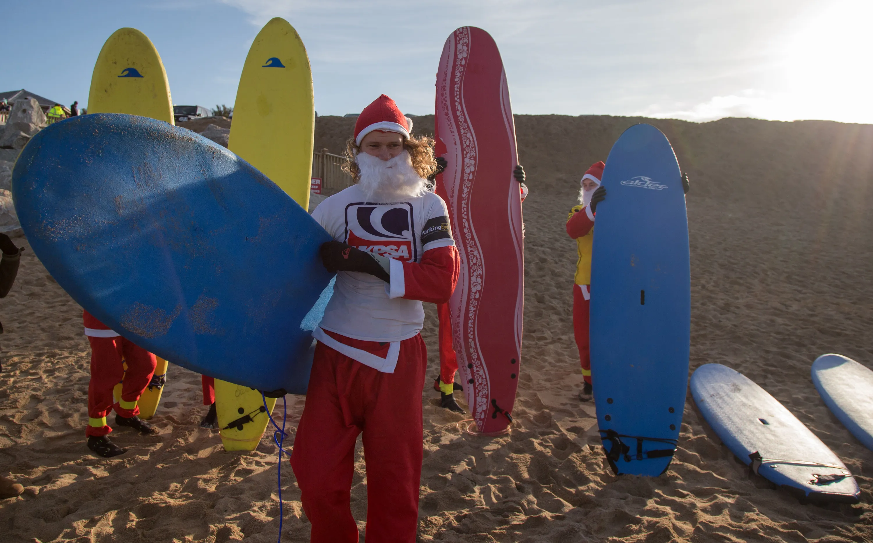 A surfer dressed as Santa gets ready to brave the cold seas and near flat waves during the annual Surfing Santa as part of the Santa Run and Surf 2016 at Fistral Beach in Newquay on December 4, 2016 in Cornwall, England. (Photo by Matt Cardy/Getty Images)