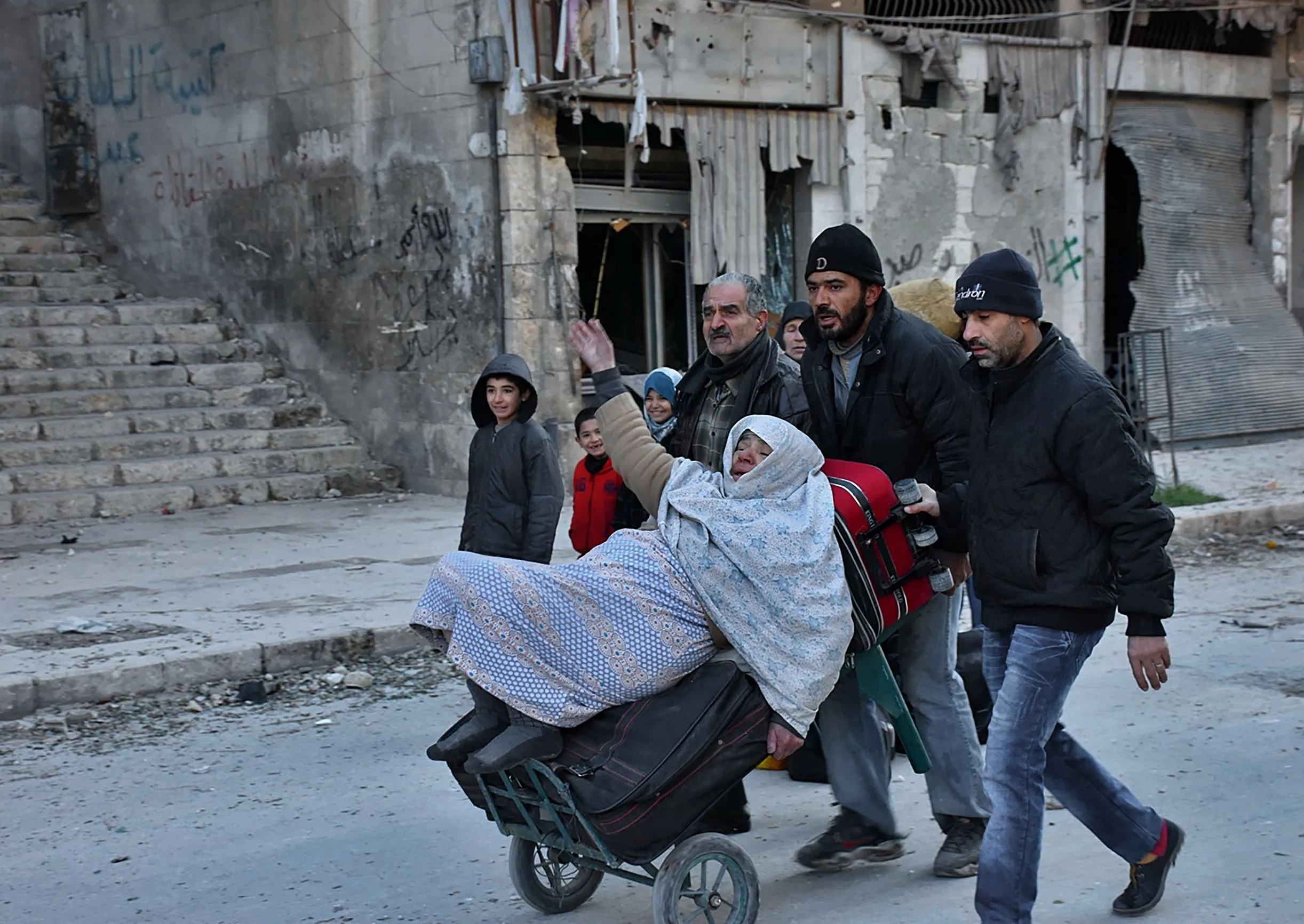 Syrian residents fleeing the violence in the eastern rebel- held parts of Aleppo evacuate from their neighbourhoods through the Bab al- Hadid district after it was seized by the government forces, on December 7, 2016. (Photo by George Ourfalian/AFP Photo)