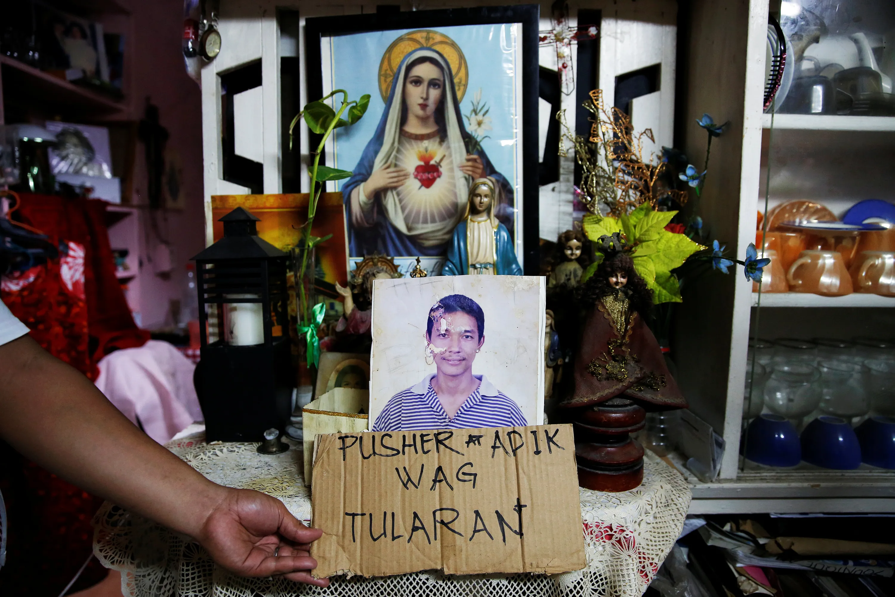 A relative holds a cardboard sign next to a picture of Florjohn Cruz inside the house where he was killed in a police drugs buy-bust operation in Manila, Philippines late October 20, 2016. The sign, which the family said they found at the house, translates as “PUSHER AND ADDICT – DON’T IMITATE”. (Photo by Damir Sagolj/Reuters)