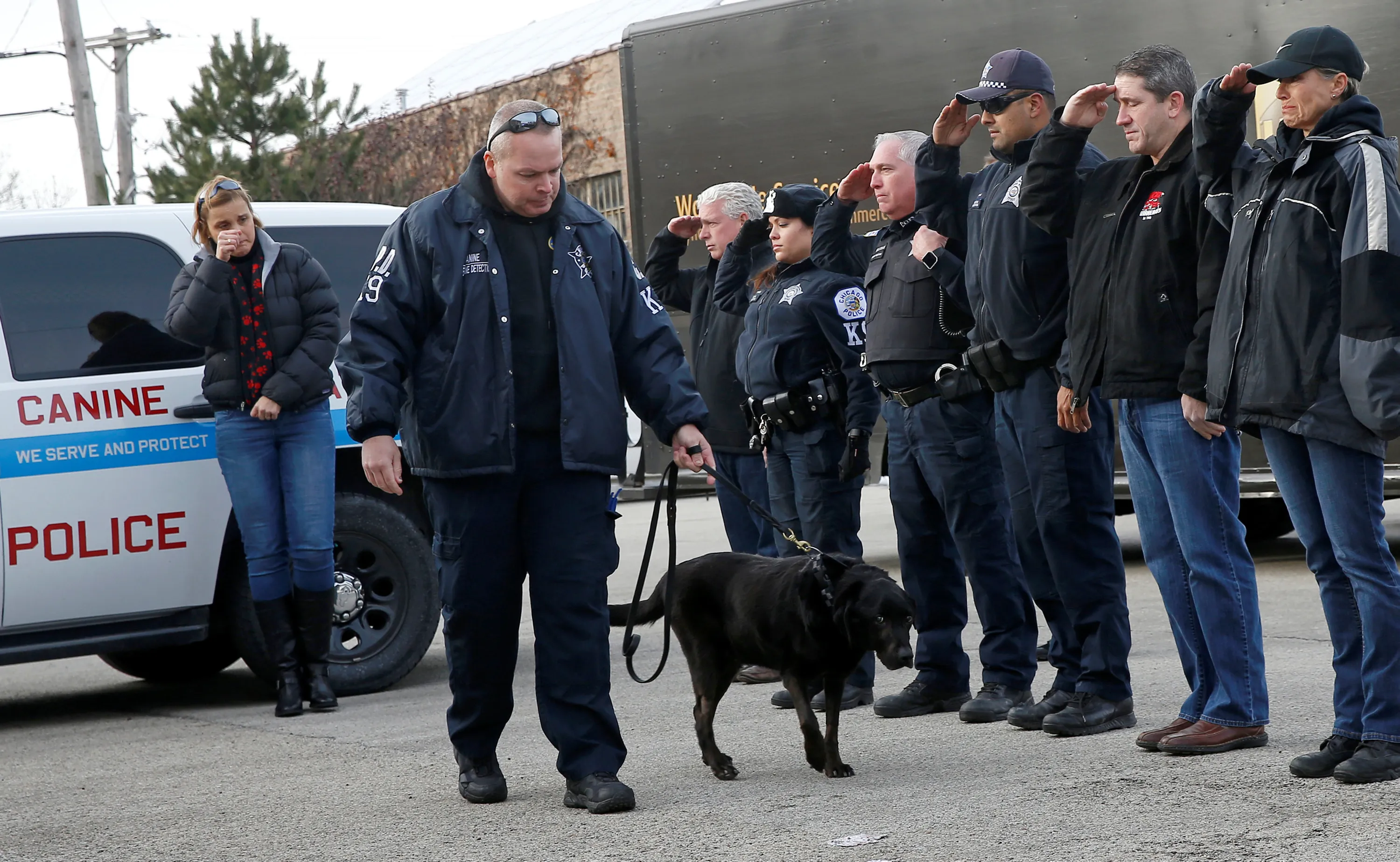 Chicago Police officers salute Officer Michael Walters and his explosives detection canine “Bob” as they arrive at the Niles Veterinary Hospital where the dog is to be humanely euthanized after being diagnosed with brain cancer in Niles, Illinois, U.S., December 7, 2016. (Photo by Jim Young/Reuters)