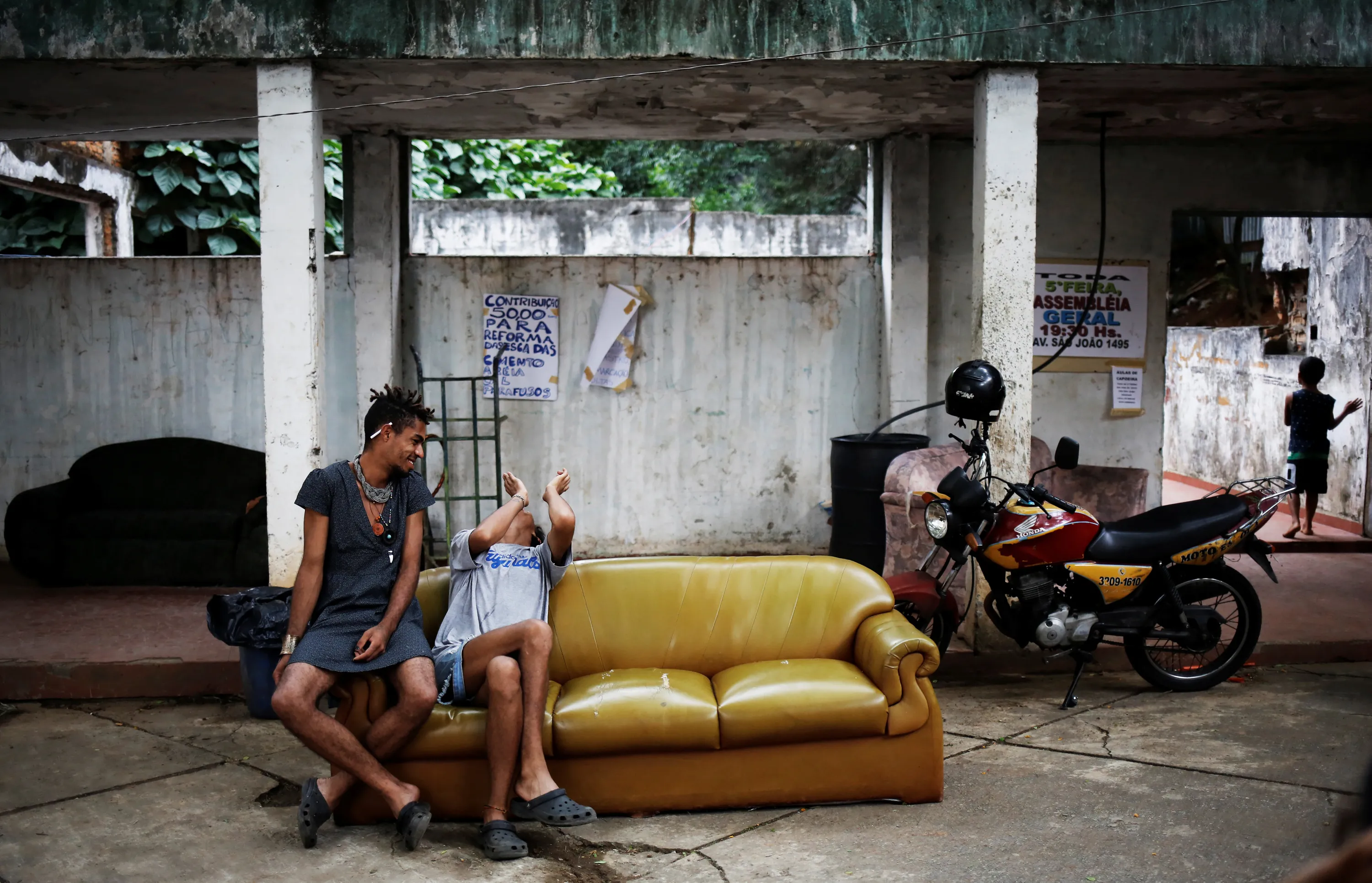 Teflon (L), 19, and Gaby, 18, who are among members of lesbian, gay, bisexual and transgender (LGBT) community, that have been invited to live in a building that the roofless movement has occupied, sit on a sofa, in downtown Sao Paulo, Brazil, November 17, 2016. (Photo by Nacho Doce/Reuters)