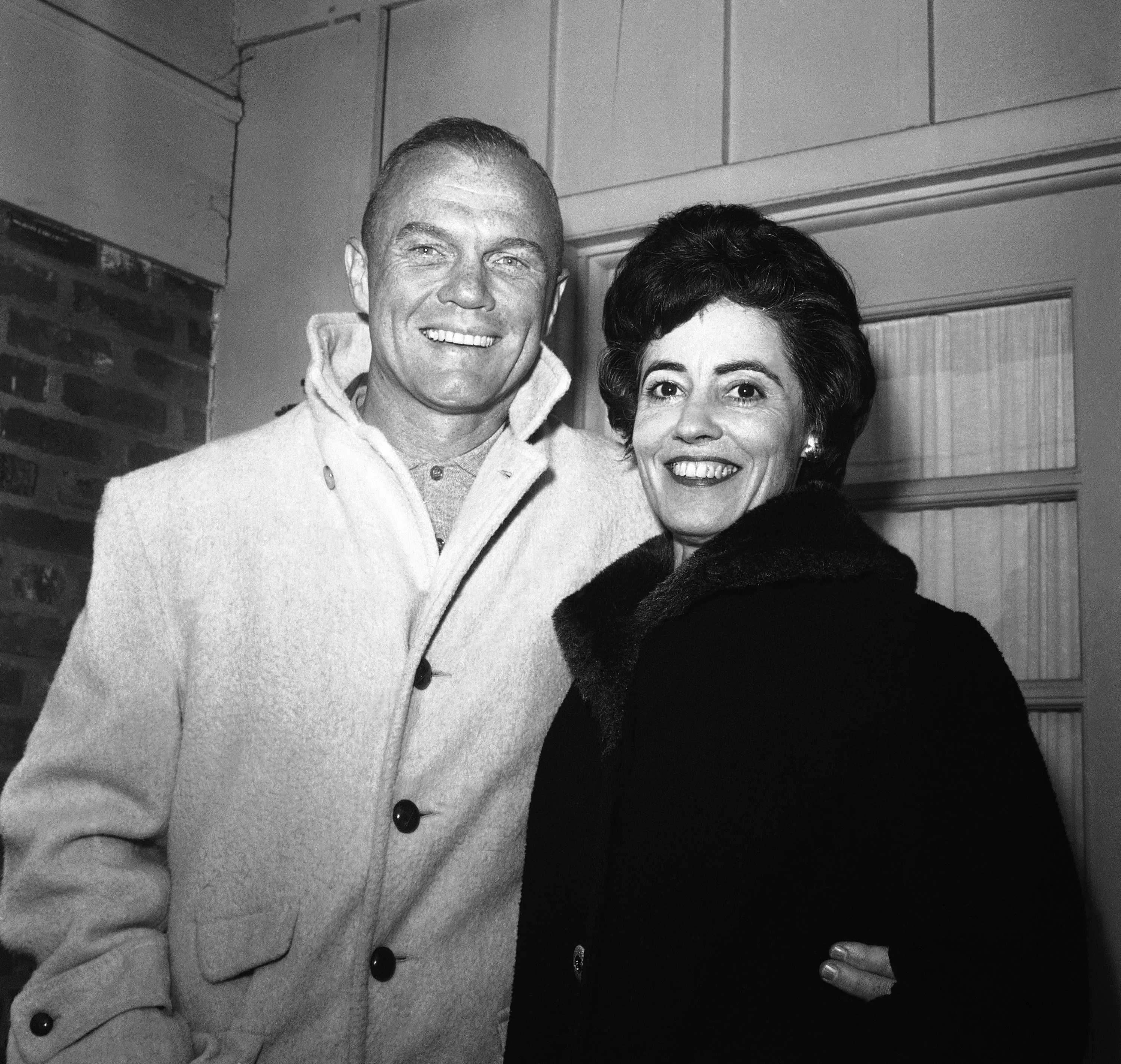 Astronaut John H. Glenn Jr. shown with his wife, Annie outside their Arlington, Va., home on February 3, 1962, during his first news conference. Glenn spent more than five hours in the Mercury capsule atop a rocket at Cape Canaveral, Florida a week ago only to have the shot postponed. Glenn said he is anxious to get ahead with is orbit of the earth. (Photo by Bob Schutz/AP Photo)