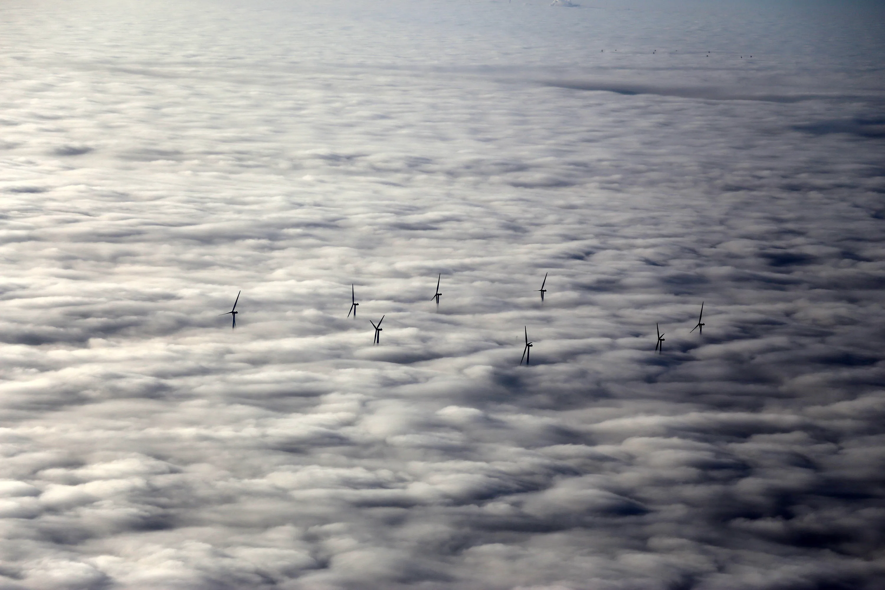 In this December 4, 2016 photo wind turbines stand out of the fog near Rotenburg, northern Germany. Large parts of northern Germany were under thick fog on Sunday. (Photo by Stefan Rampfel/DPA via AP Photo)