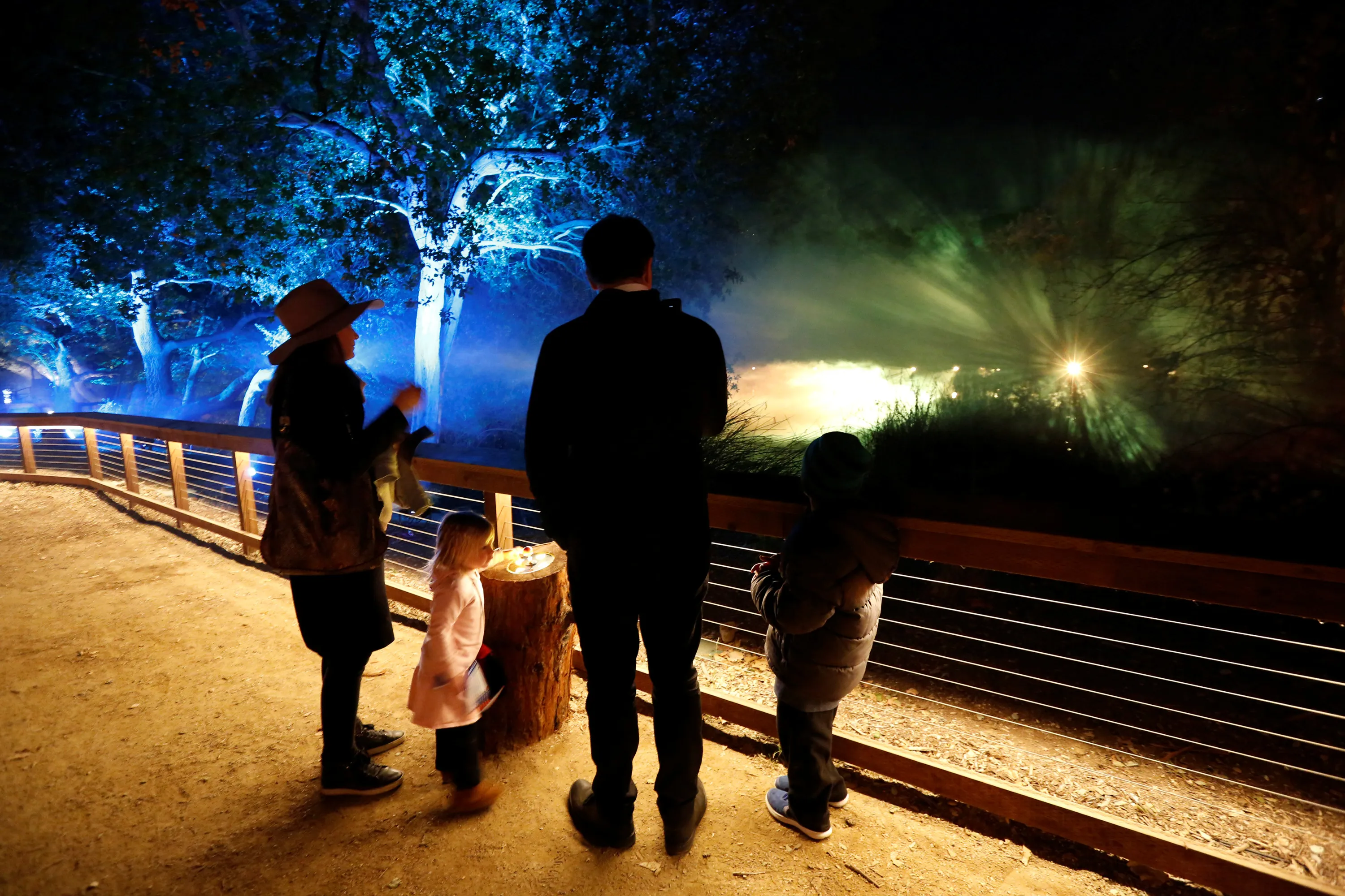 A child interacts with “Lightwave Lake” which is part of the exhibit “Enchanted: Forest of Light” at Descanso Gardens in La Canada Flintridge, California U.S., December 9, 2016. (Photo by Mario Anzuoni/Reuters)