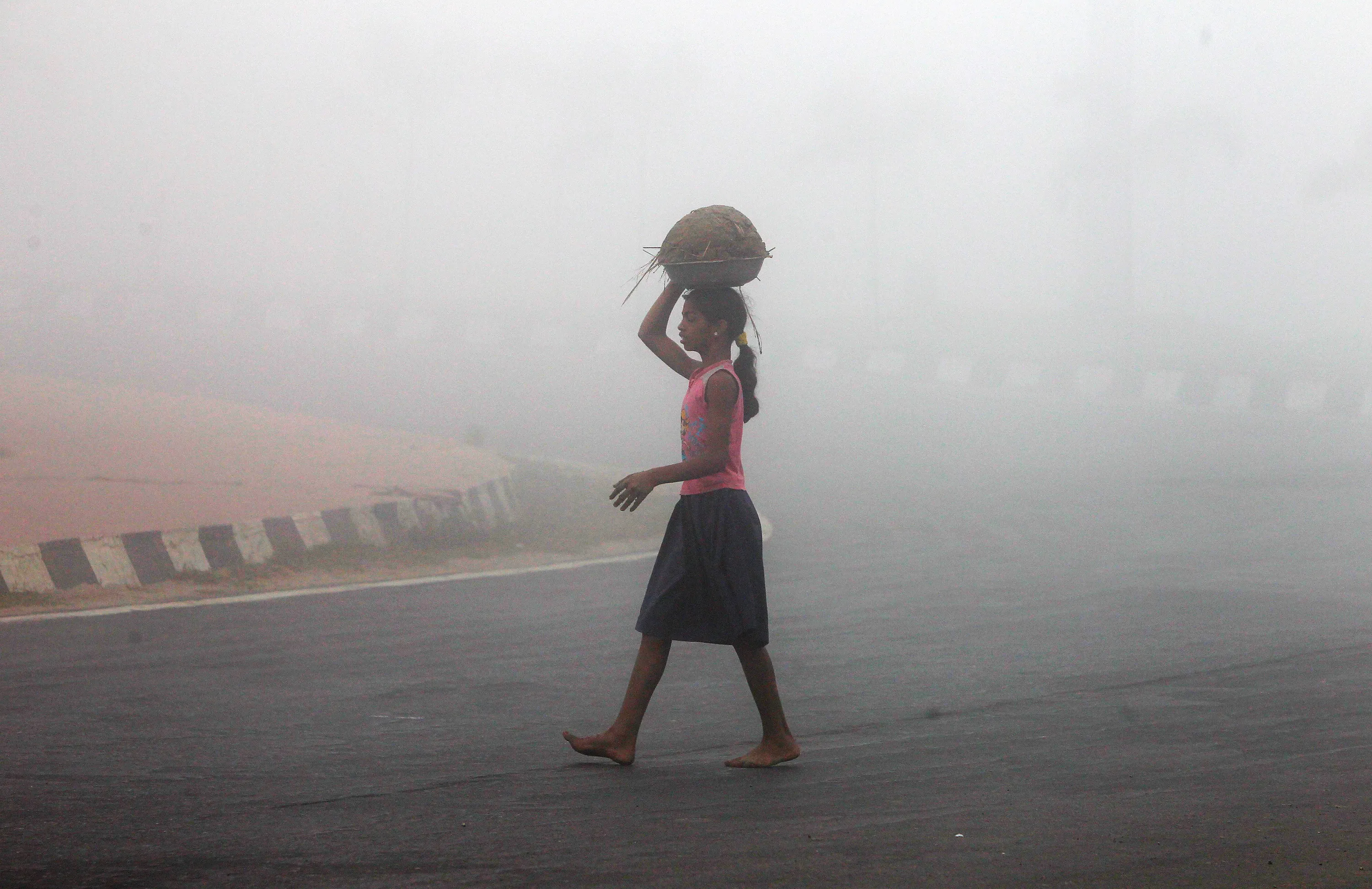 A girl carries a basket of cow-dung as she crosses a road on a foggy winter morning in Agartala, India, December 11, 2016. (Photo by Jayanta Dey/Reuters)