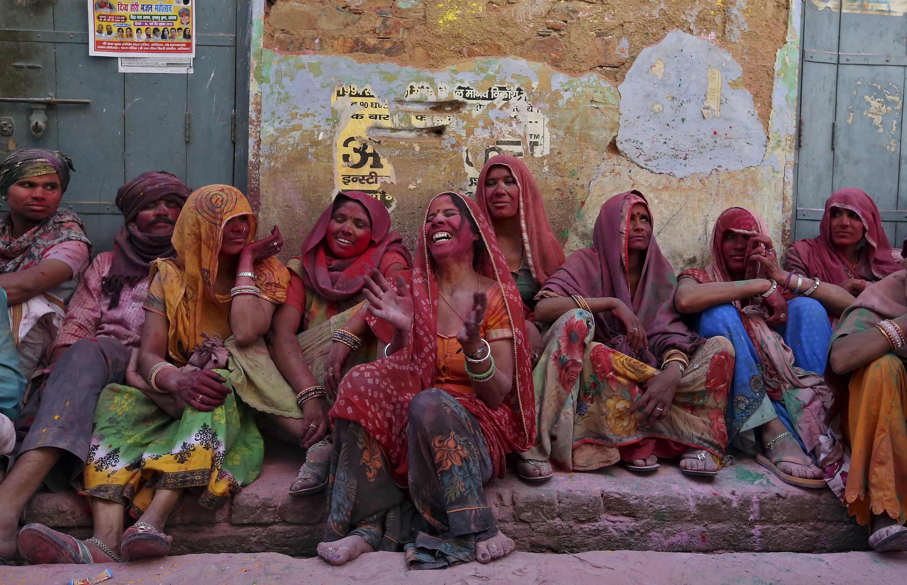 Hindu devotees laugh as they watch the religious festival of Lathmar Holi, where women beat the men with sticks, in the town of Barsana in Uttar Pradesh March 17, 2016. (Photo by Cathal McNaughton/Reuters)