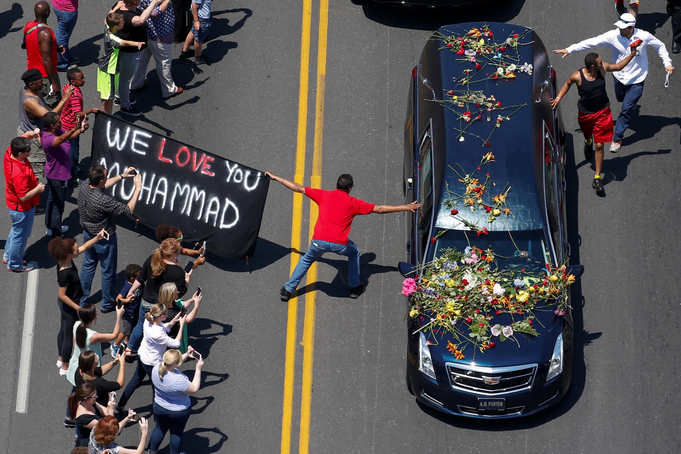 A banner stating “We Love You Muhammad” is displayed as well-wishers touch the hearse carrying the body of the late boxing champion Muhammad Ali during his funeral procession through Louisville, Kentucky, June 10, 2016. (Photo by Adrees Latif/Reuters)