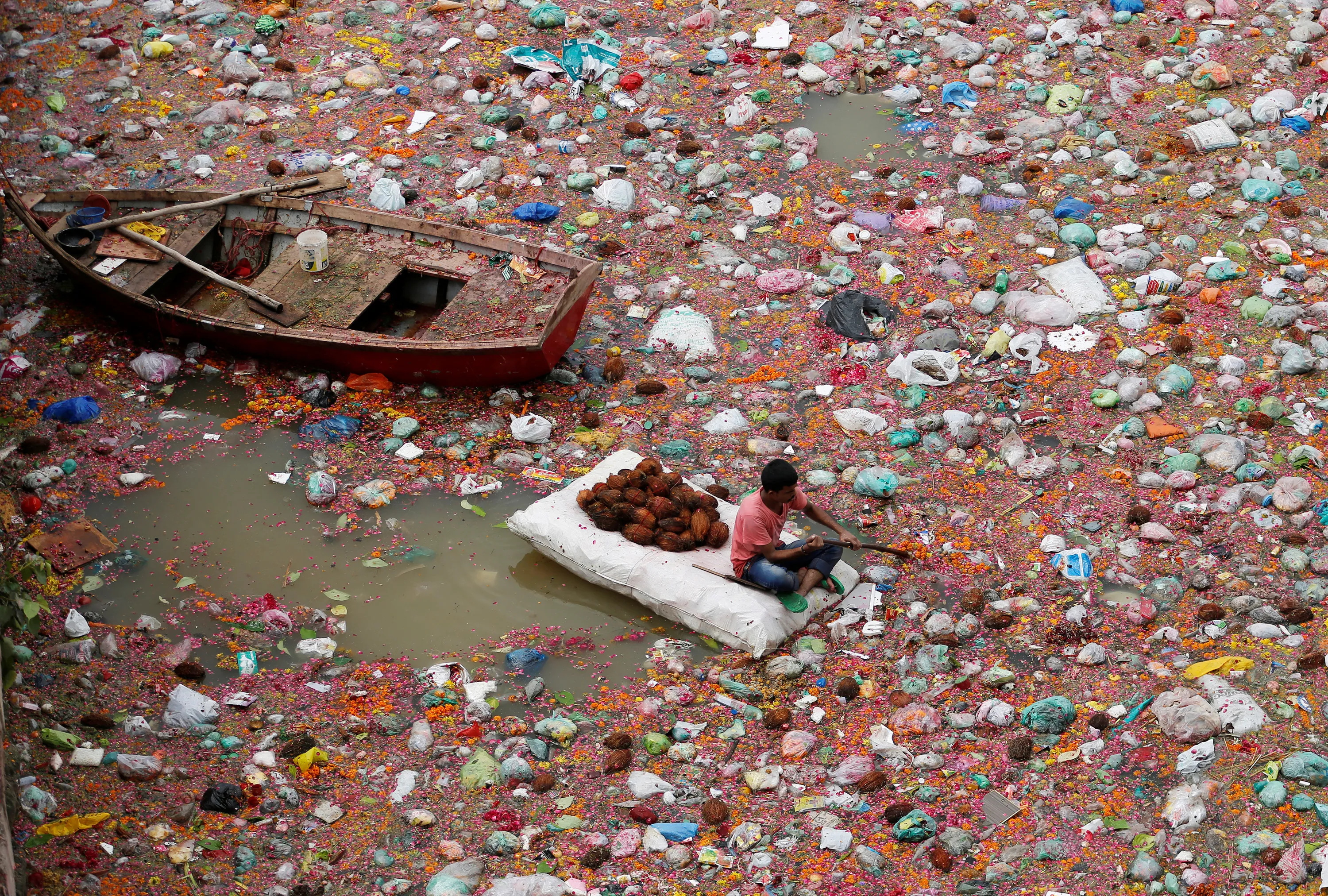A man collects coconuts and other items thrown as offerings by worshippers in the Sabarmati river, a day after the “Dashama” festival in Ahmedabad, August 12, 2016. (Photo by Amit Dave/Reuters)