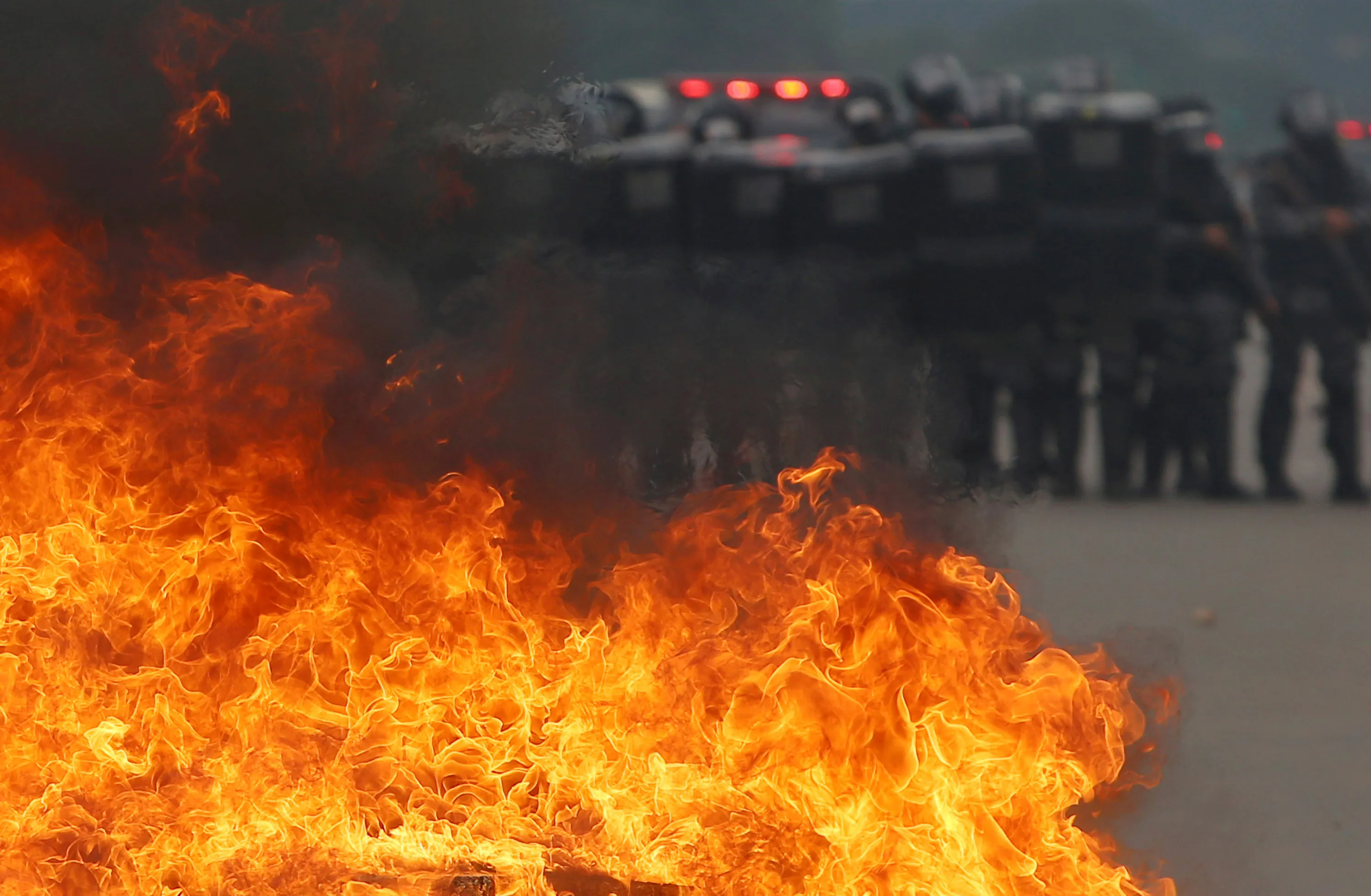 Riot policemen stand next to a barricade burned by anti-government demonstrators during a protest against the constitutional amendment PEC 55, which limits public spending, in front of Brazil's National Congress in Brasilia, Brazil December 13, 2016. (Photo by Adriano Machado/Reuters)