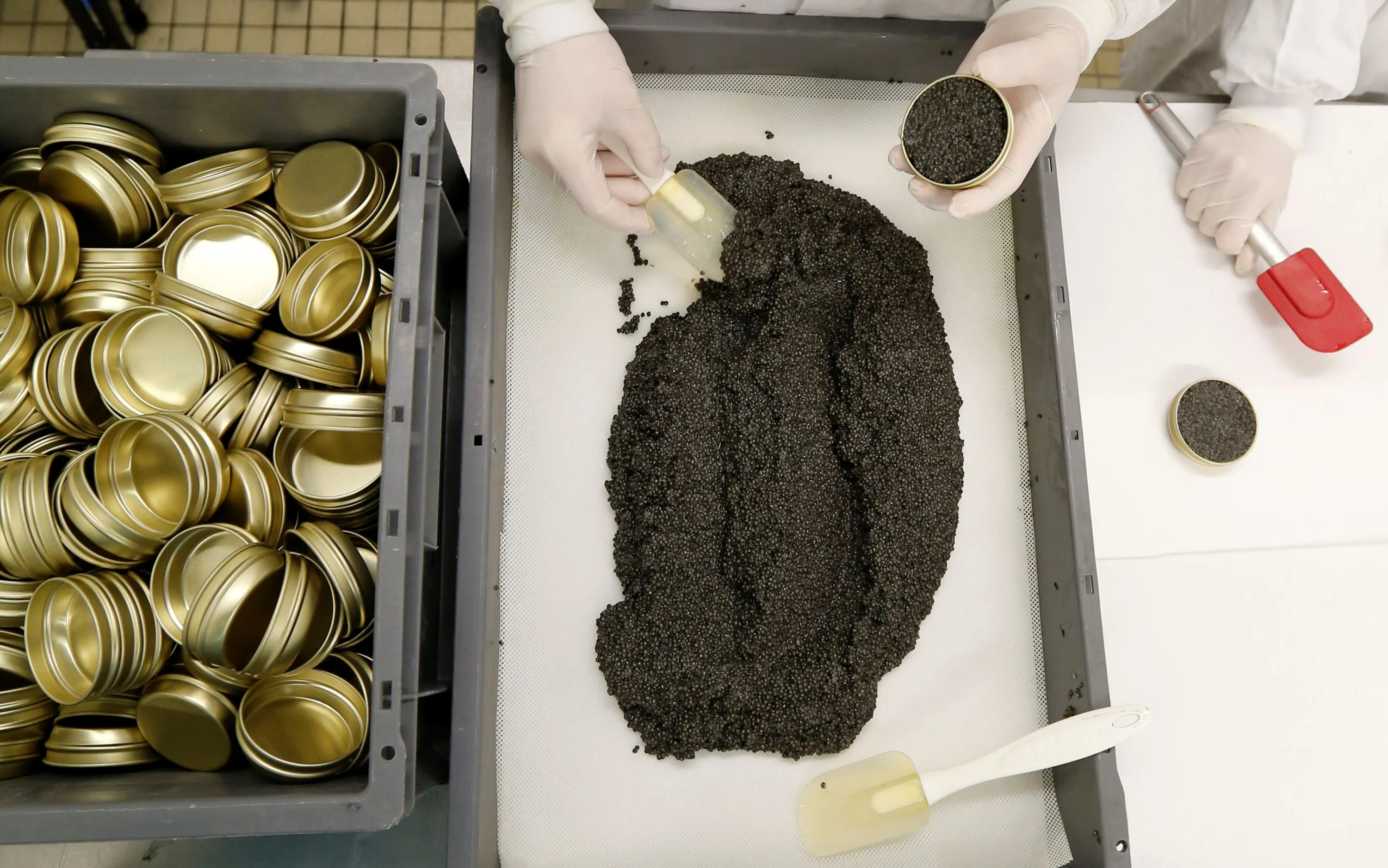 An employee prepares a tin of clean and processed caviar at the caviar fish farming company “Sturgeon”, the leading French producer, in Saint-Genis-de-Saintonge, France, November 8, 2016. (Photo by Regis Duvignau/Reuters)