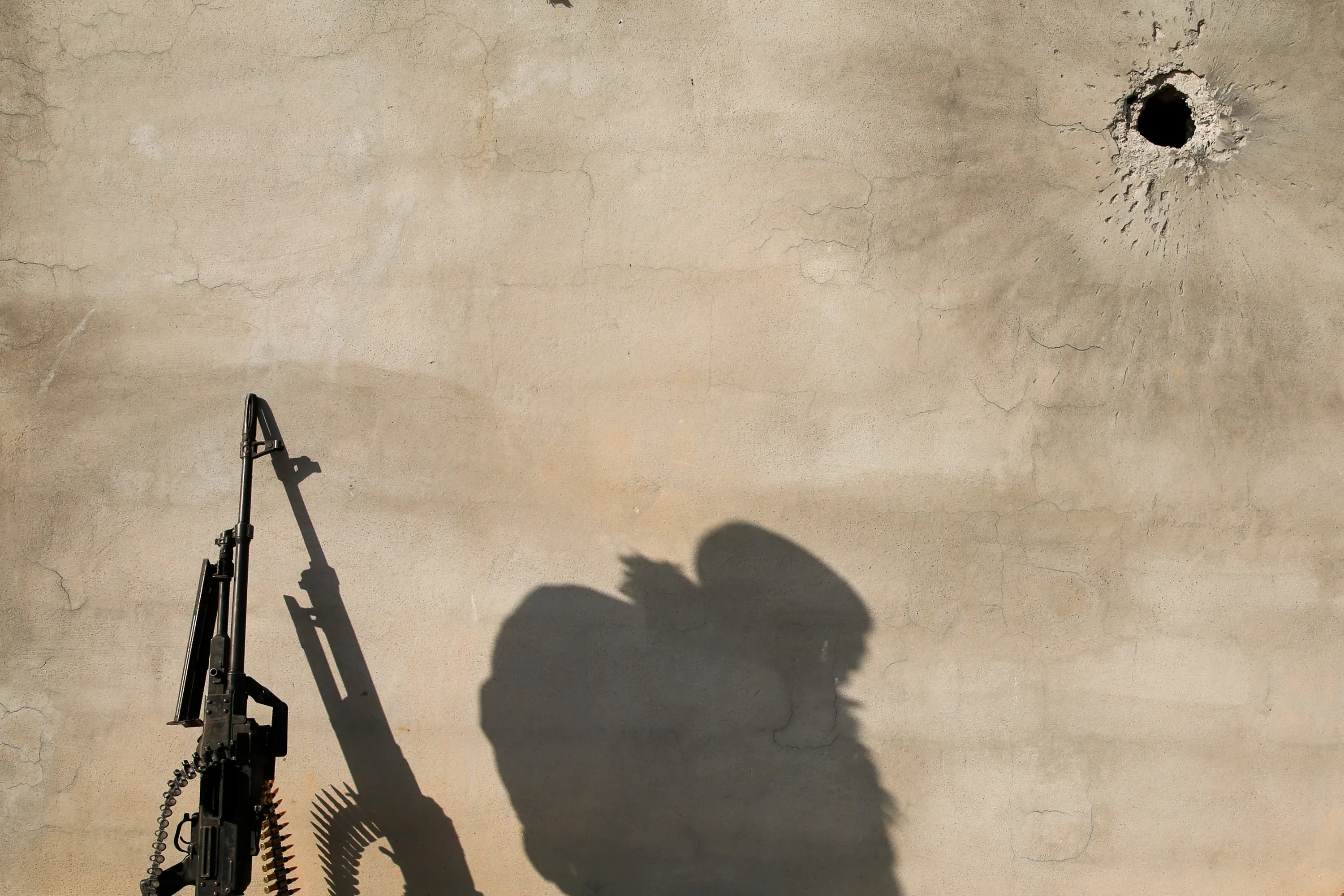 The shadow of a member of the Iraqi Army is cast on a wall during clashes with Islamic State militants at the south of Mosul, Iraq December 12, 2016. (Photo by Ammar Awad/Reuters)