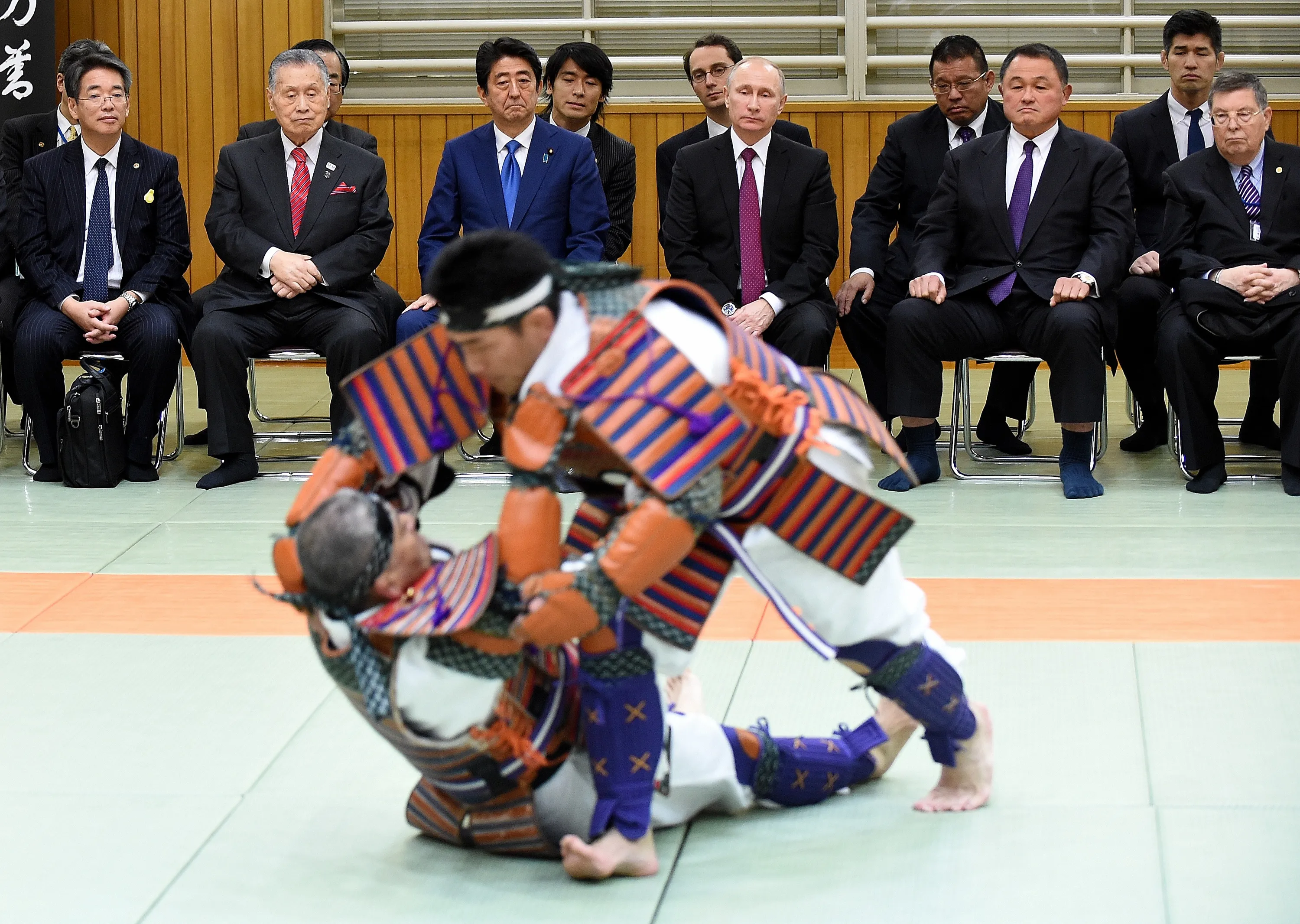 Russian President Vladimir Putin (3rd R), Japanese Prime Minister Shinzo Abe (3rd L), former Japanese Prime Minister Yoshiro Mori (2nd L) and vice chairman of the All Japan Judo Federation Yasuhiro Yamashita (2nd R) watch a demonstration of ancient custom judo during a visit to the Kodokan judo hall in Tokyo on December 16, 2016. Putin is on a two-day official visit to Japan. (Photo by Toru Yamanaka/AFP Photo)