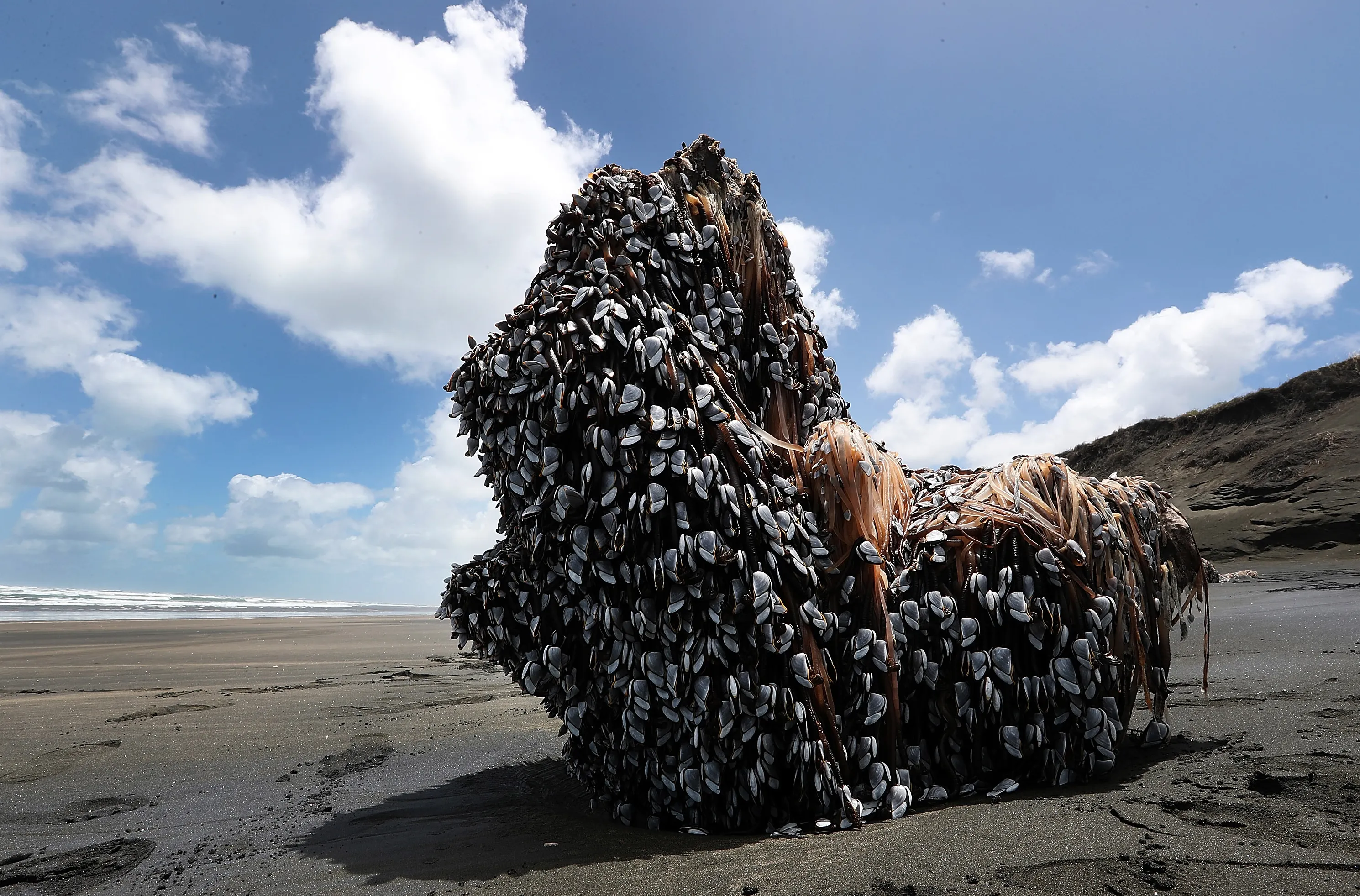 A large driftwood tree covered in gooseneck barnacles sits in the sun on Auckland's west coast on December 12, 2016 in Auckland, New Zealand. The large object washed up on Muriwai beach on Saturday, 10 December. (Photo by Fiona Goodall/Getty Images)