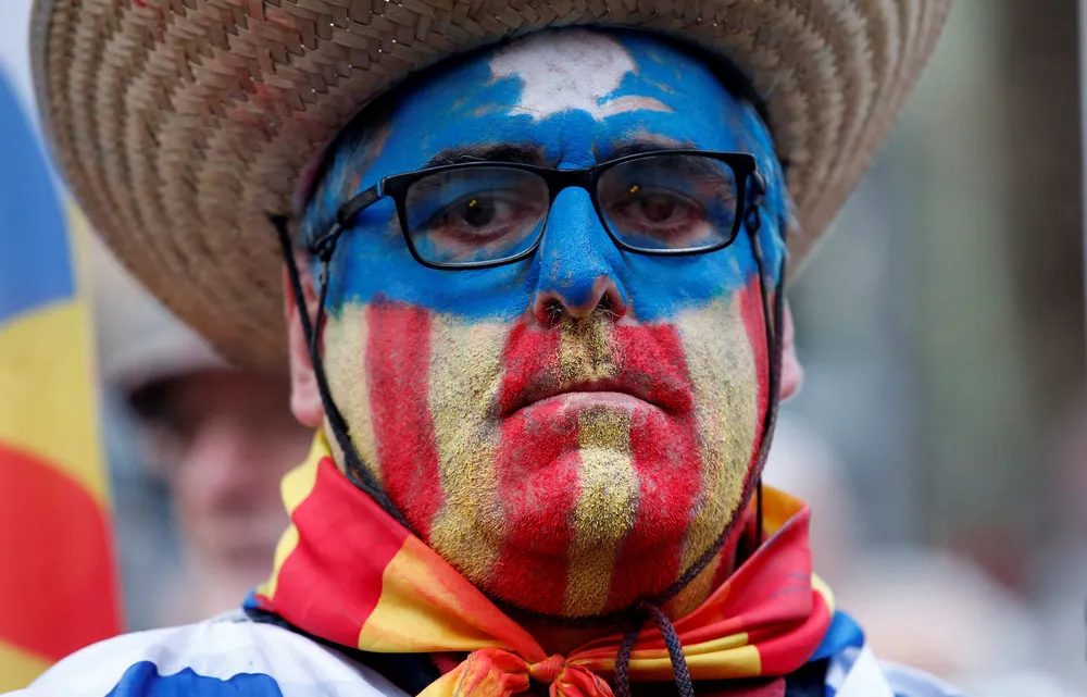 A supporter of Catalunya Parliament's President Carme Forcadell, with an estelada (Catalan separatist flag) painted on his face, is pictured in front of the court in Barcelona, Spain, December 16, 2016. (Photo by Albert Gea/Reuters)
