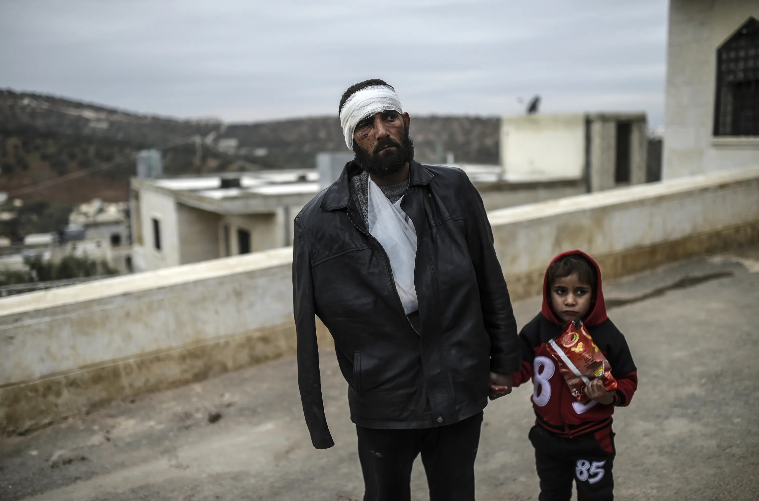 An injured Syrian man who just arrived on the Syrian side of the Bab al-Hawa border crossing between Syria and Turkey waits with his child outside a hospital on December 16, 2016. The Syrian government suspended the evacuation of the last rebel-held parts of Aleppo, but a military source denied a Russian statement that the operation was “complete”. (Photo by Bulent Kilic/AFP Photo)