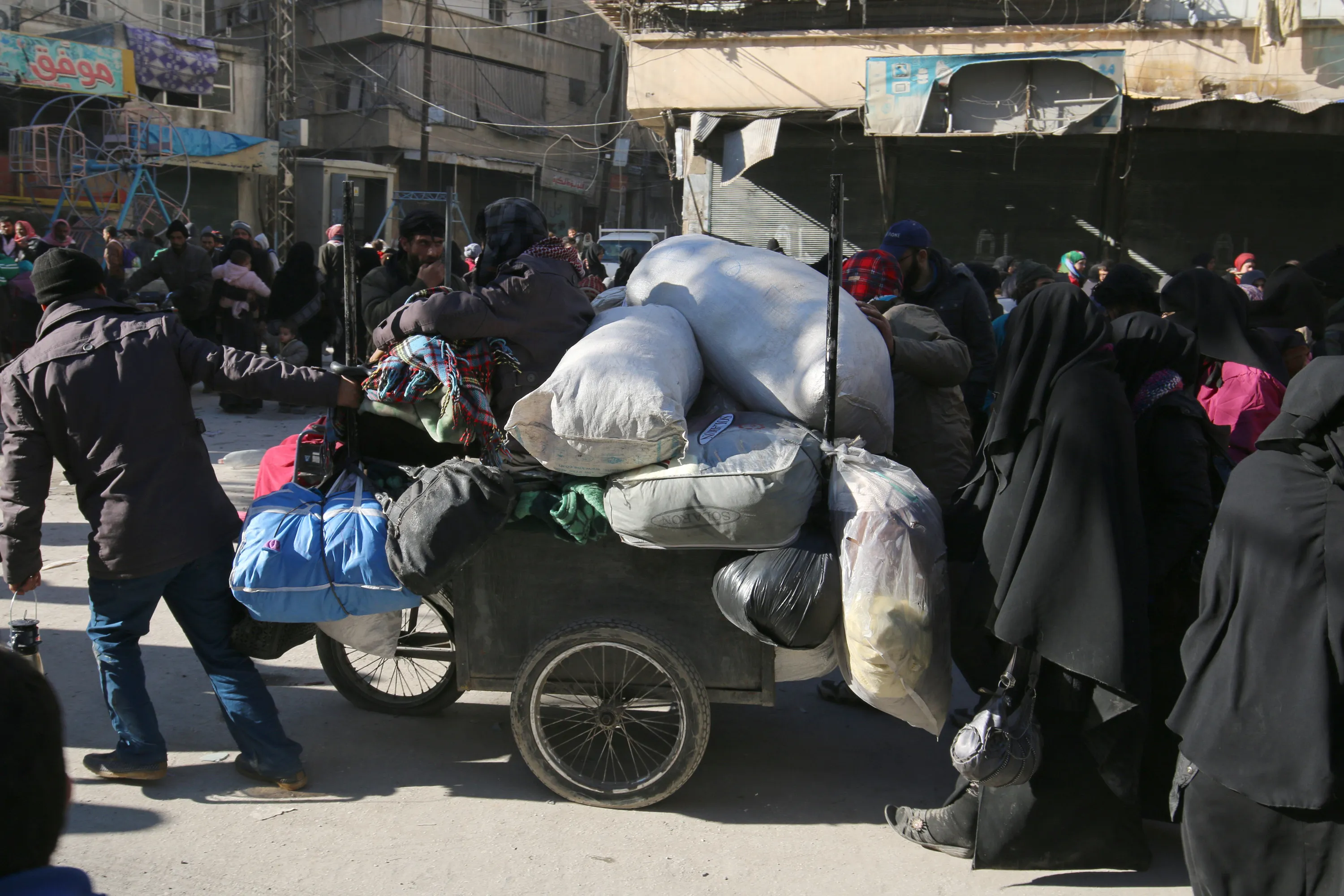 People walk with their belongings as they gather to be evacuated from a rebel-held sector of eastern Aleppo, Syria December 15, 2016. (Photo by Abdalrhman Ismail/Reuters)