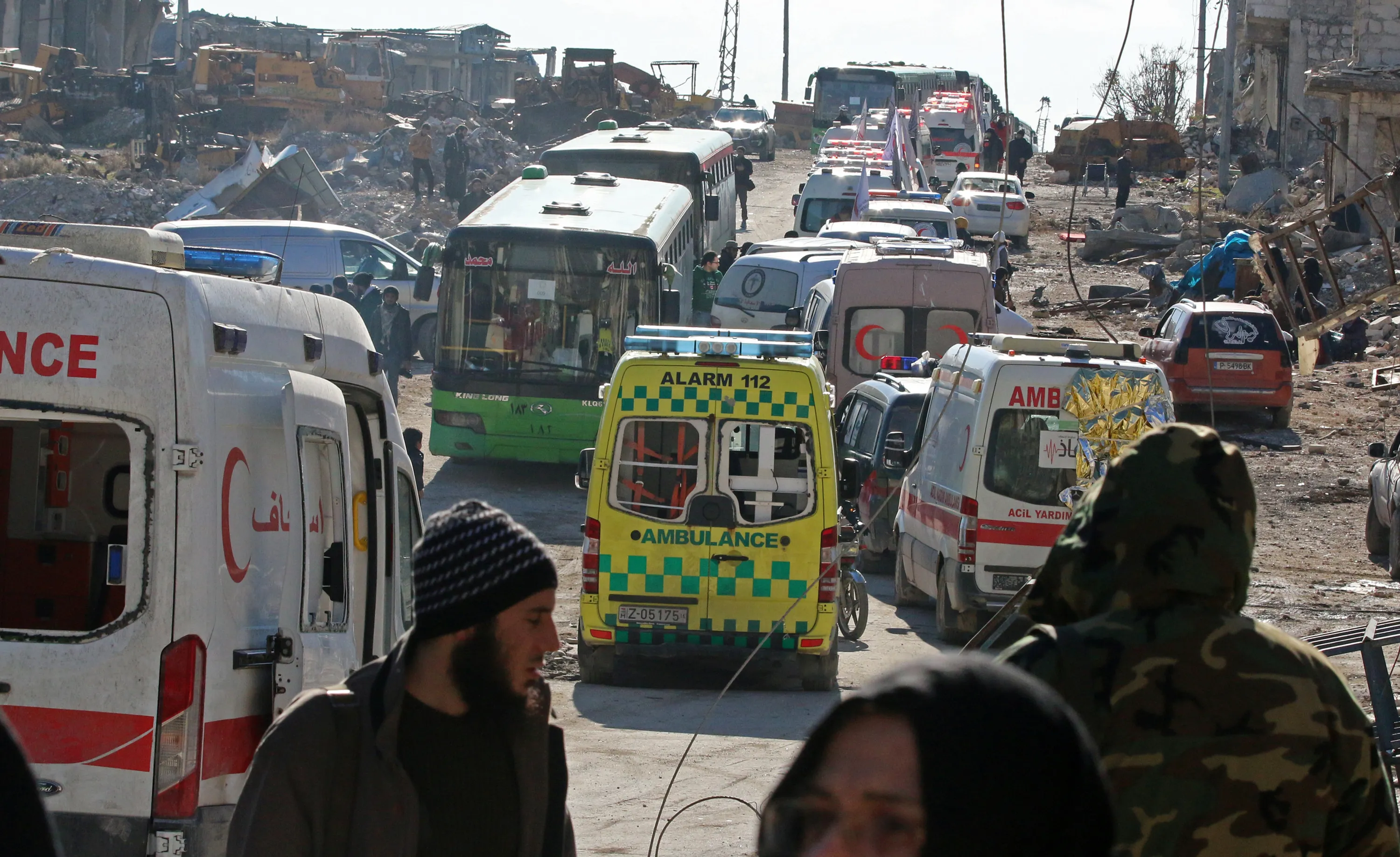 Ambulances and buses wait as they evacuate people from a rebel-held sector of eastern Aleppo, Syria December 15, 2016. (Photo by Abdalrhman Ismail/Reuters)