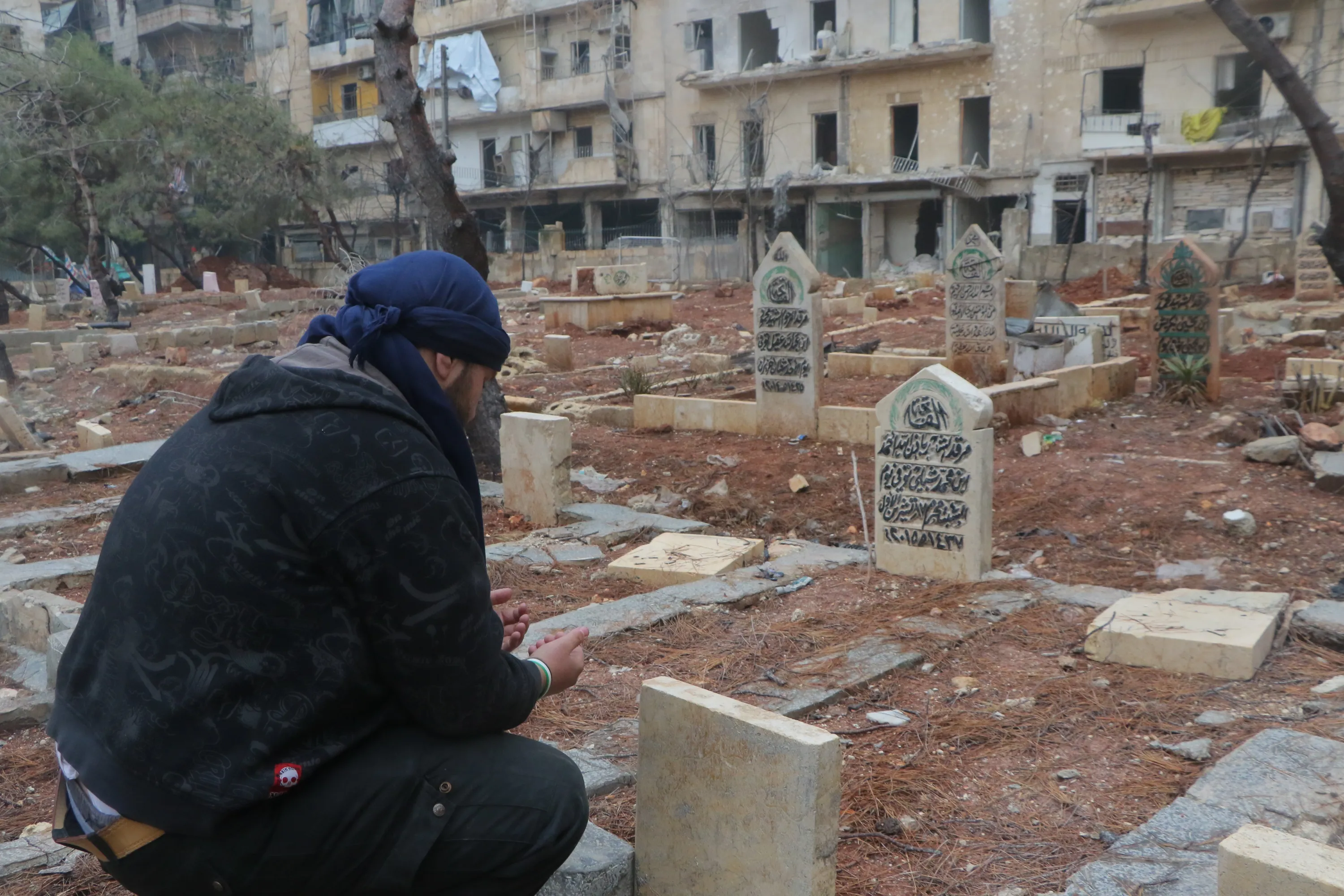 A man prays over the graves of family members in al-Mashhad neighborhood in Aleppo, Syria on December 14, 2016. (Photo by Ibrahim Ebu Leys/Anadolu Agency/Getty Images)