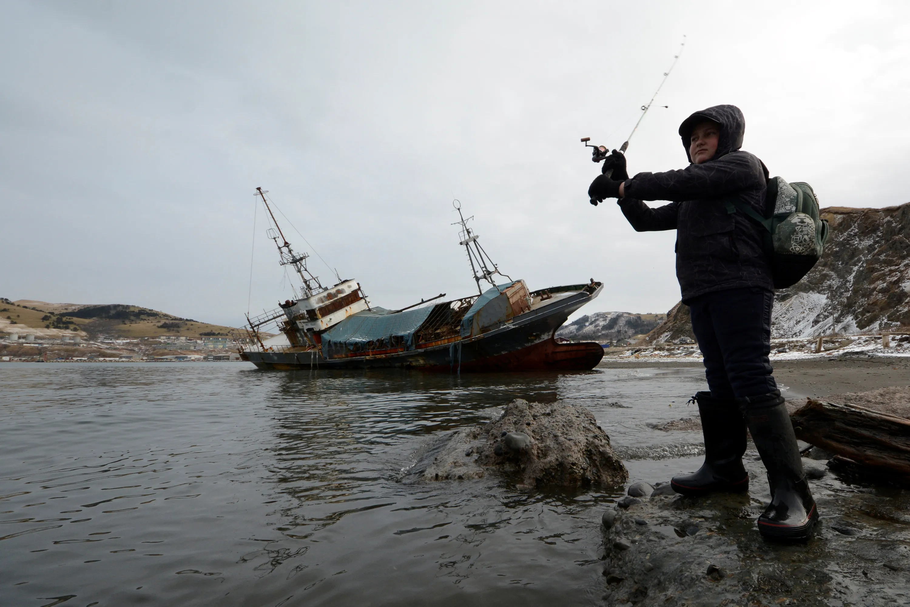 A boy fishes on the banks of Malokurilskaya Bay in the village of Malokurilskoye on the island of Shikotan, Southern Kuriles, Russia, December 18, 2016. (Photo by Yuri Maltsev/Reuters)