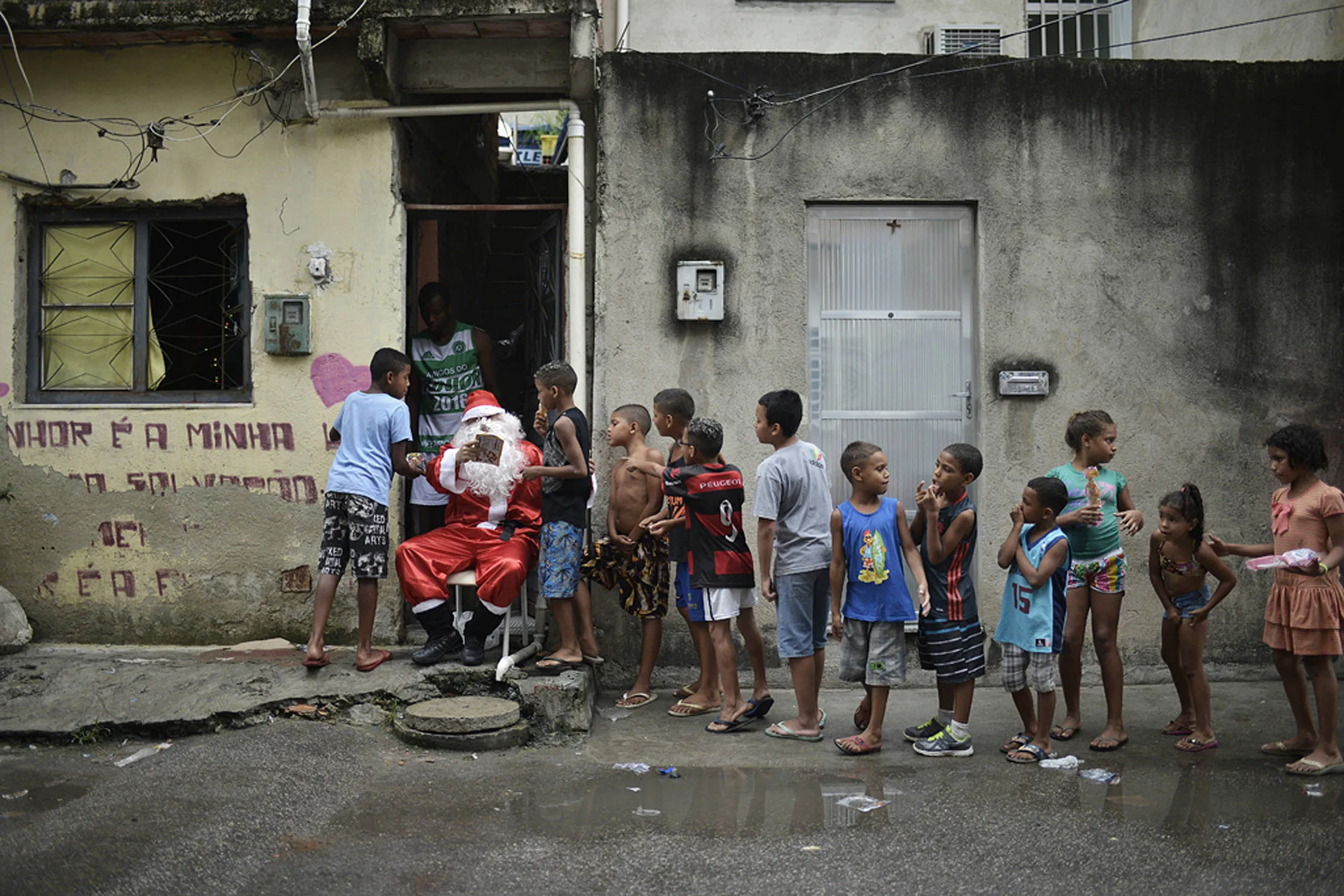 Leandro Souza, 28, who lives in the favela da Mare complex, one of the most violents in Rio de Janeiro, dresses as Santa Claus to distribute gifts to the children of the community in Rio de Janeiro, Brazil on December 17, 2016. (Photo by Fabio Teixeira/AFP Photo)