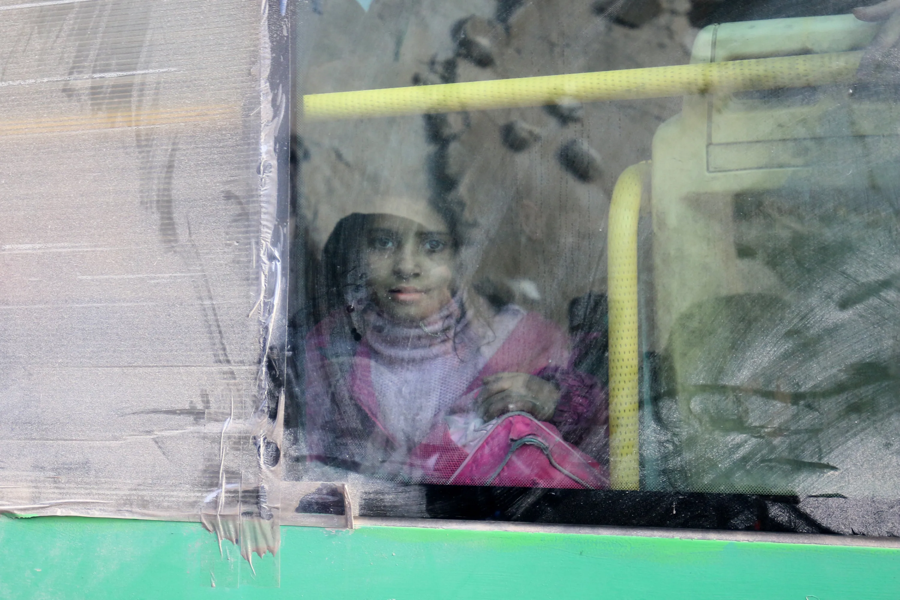 A girl rides a bus to be evacuated from a rebel-held sector of eastern Aleppo, Syria December 18, 2016. Picture taken December 18, 2016. The reflection on the window shows a damaged building. (Photo by Abdalrhman Ismail/Reuters)