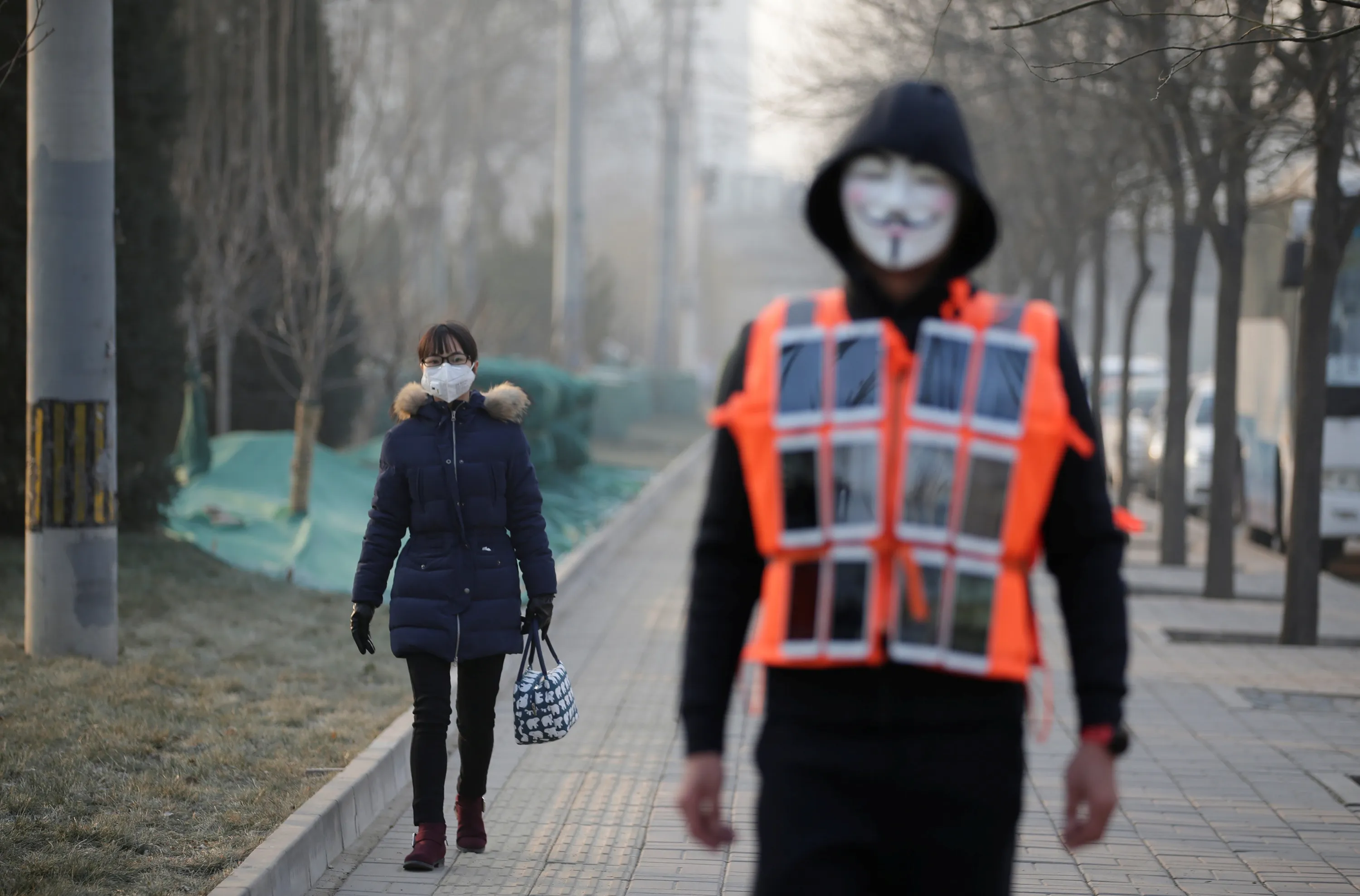 A woman is pictured behind artist Liu Bolin wearing a vest with 24 mobile phones as he walks along a street during a live broadcast of air pollution in the city on the fourth day after a red alert was issued for heavy air pollution in Beijing, China, December 19, 2016. (Photo by Jason Lee/Reuters)