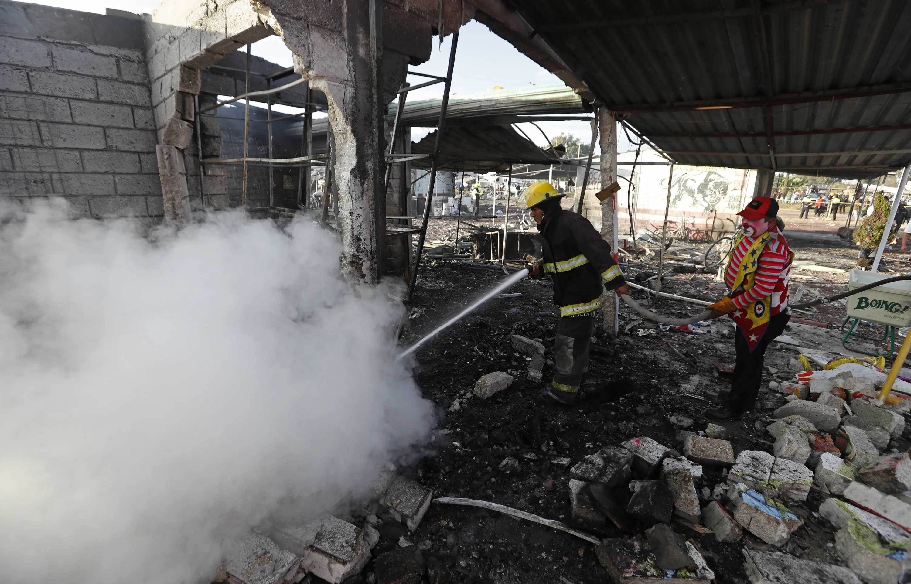 A local resident dressed as a clown helps a firefighter at the scorched ground of Mexico's best-known fireworks market after an explosion explosion ripped through it, inTultepec, Mexico, Tuesday, December 20, 2016. National Civil Protection Coordinator Luis Felipe Puente told Milenio TV that dozens were hurt but he had no immediate report of any fatalities at the open-air San Pablito Market in Tultepec, in the State of Mexico. (Photo by Eduardo Verdugo/AP Photo)