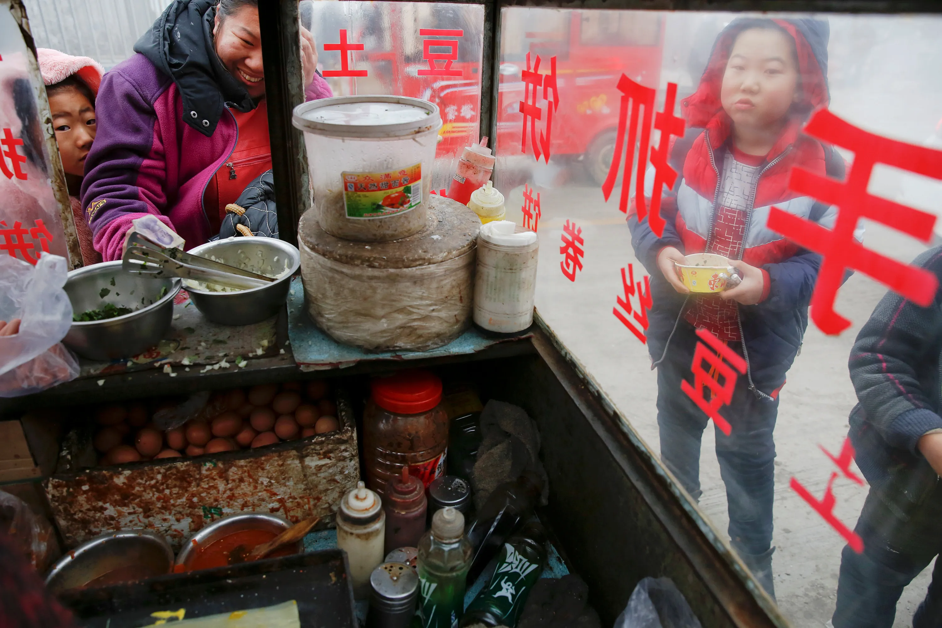 Children buy food outside their school as heavy smog blankets Shenfang in Hebei province, on an very polluted day December 20, 2016. (Photo by Damir Sagolj/Reuters)