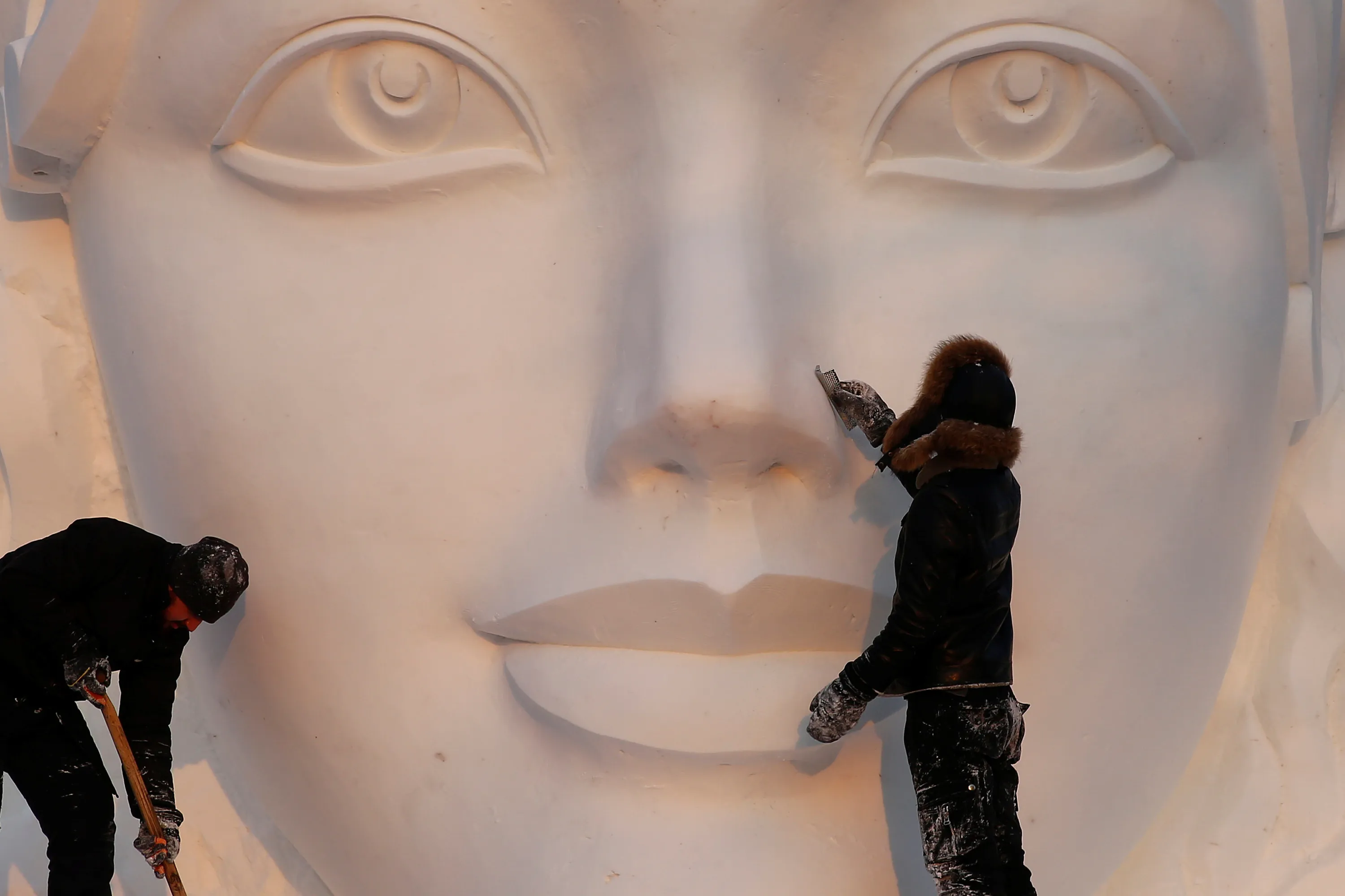 Artists prepare a snow sculpture for the upcoming Harbin International Ice and Snow Sculpture Festival, in Harbin, Heilongjiang province, China, December 17, 2016. (Photo by Aly Song/Reuters)